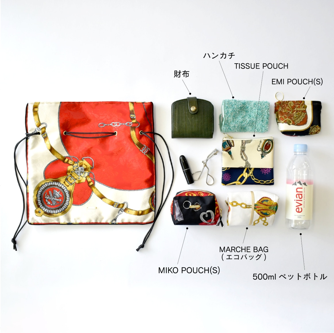 ミニ財布、スマートフォン、ティッシュポーチ、ハンカチくらいが入る大きさ。