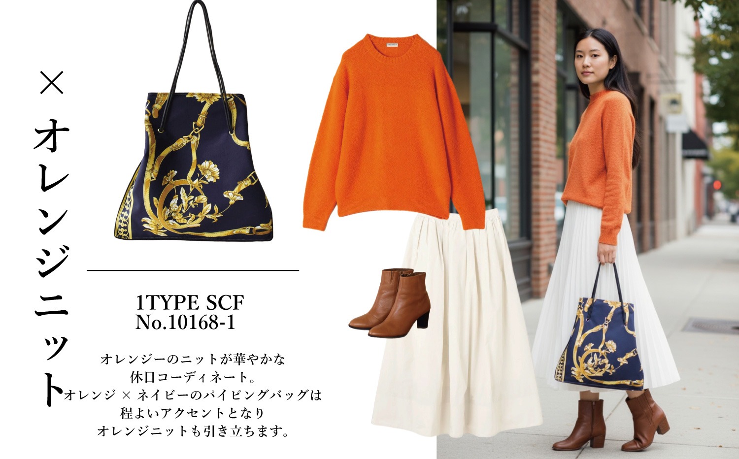 オレンジ×ネイビーのパイピングバッグは程よいアクセントとなり