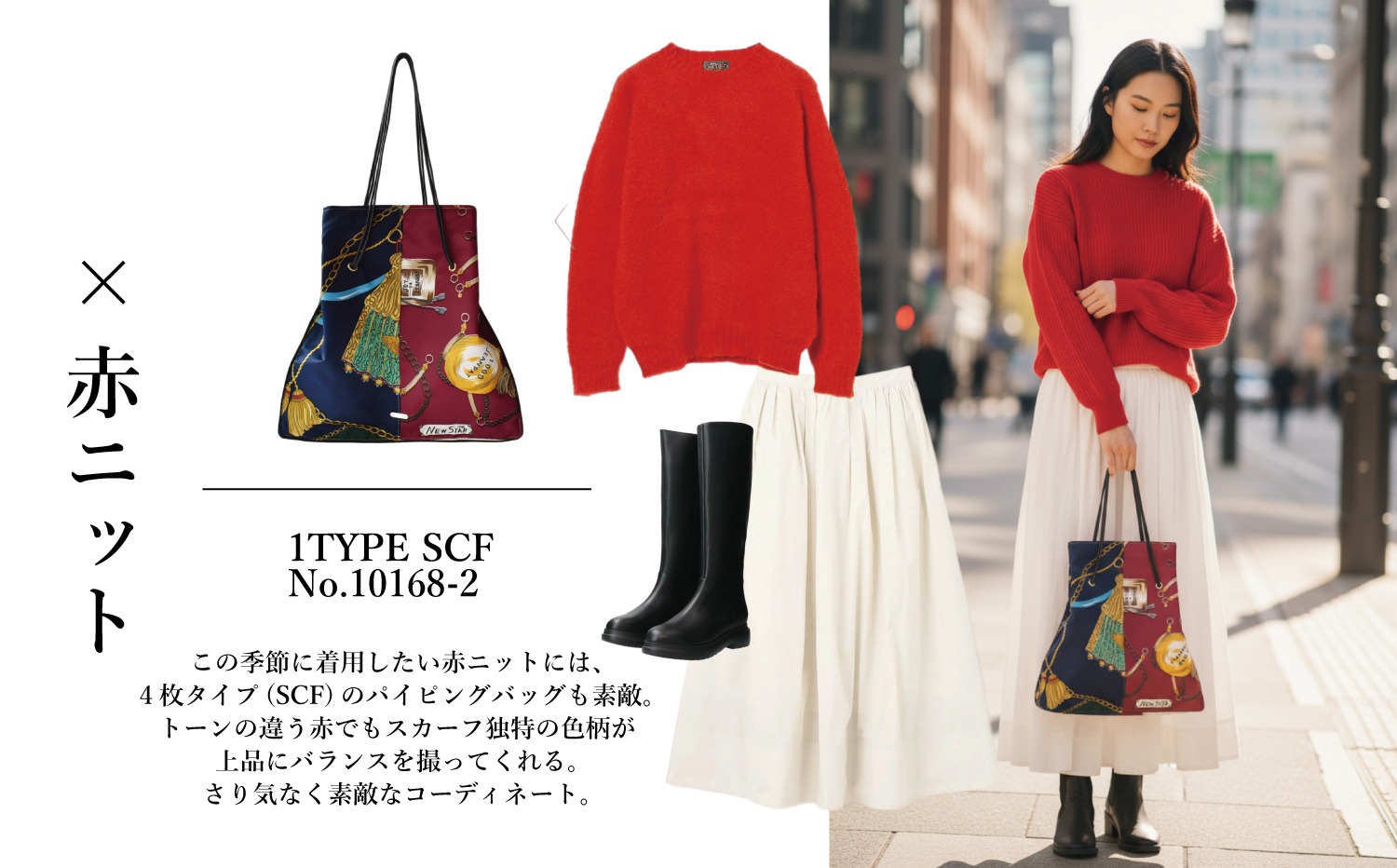 トーンの違う赤でもスカーフ独特の色柄が上品にバランスを取ってくれる。