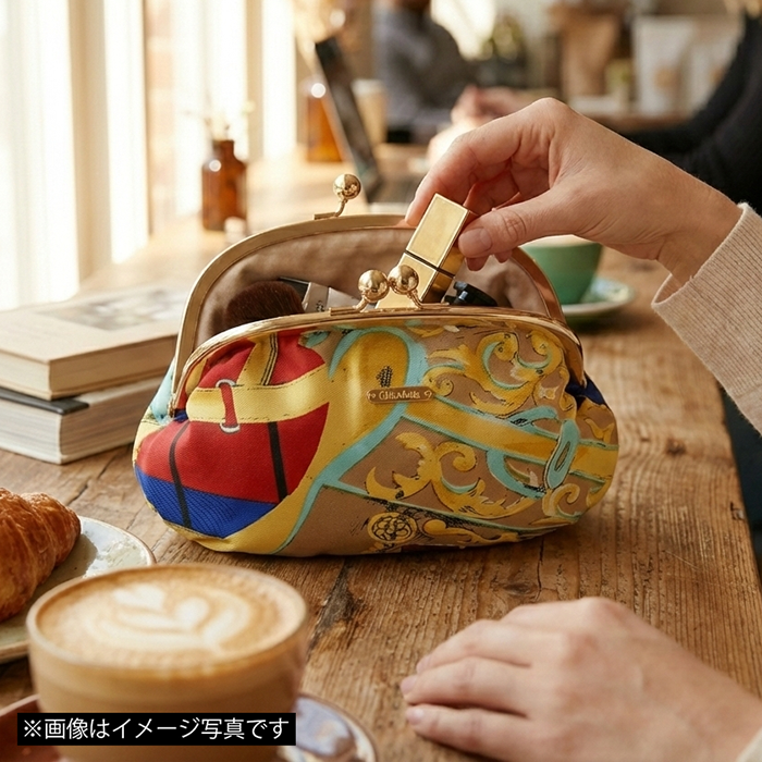 スカーフをリメイクした、がま口ポーチ。