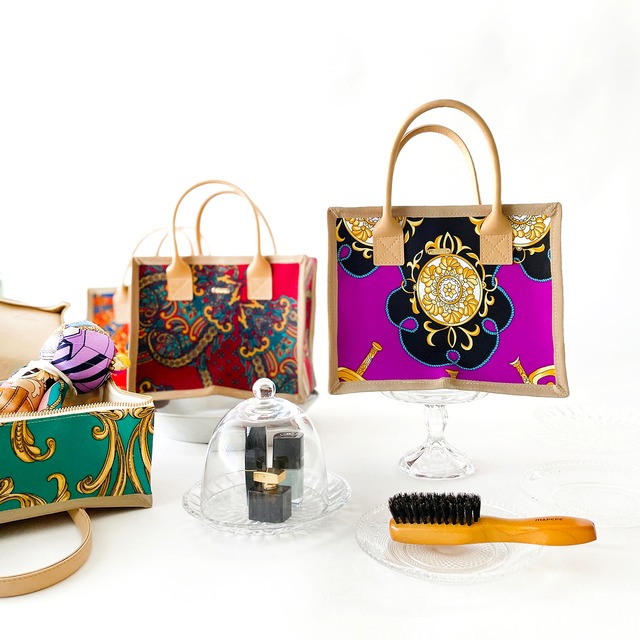ヴィンテージスカーフをリメイクしたボックス型のバッグは