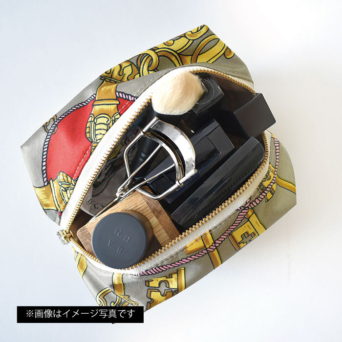 スカーフをリメイクしたマチが大きめで軽量な万能ポーチ。