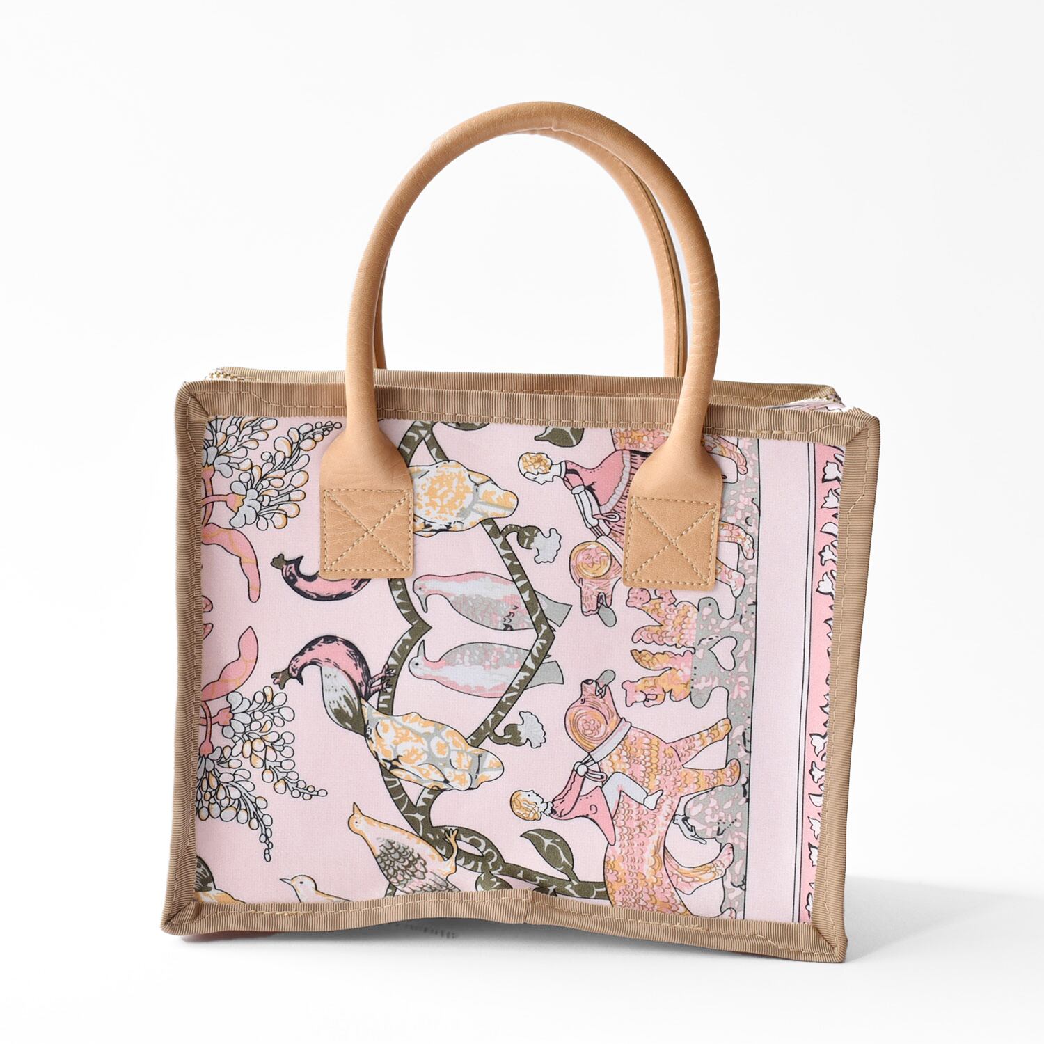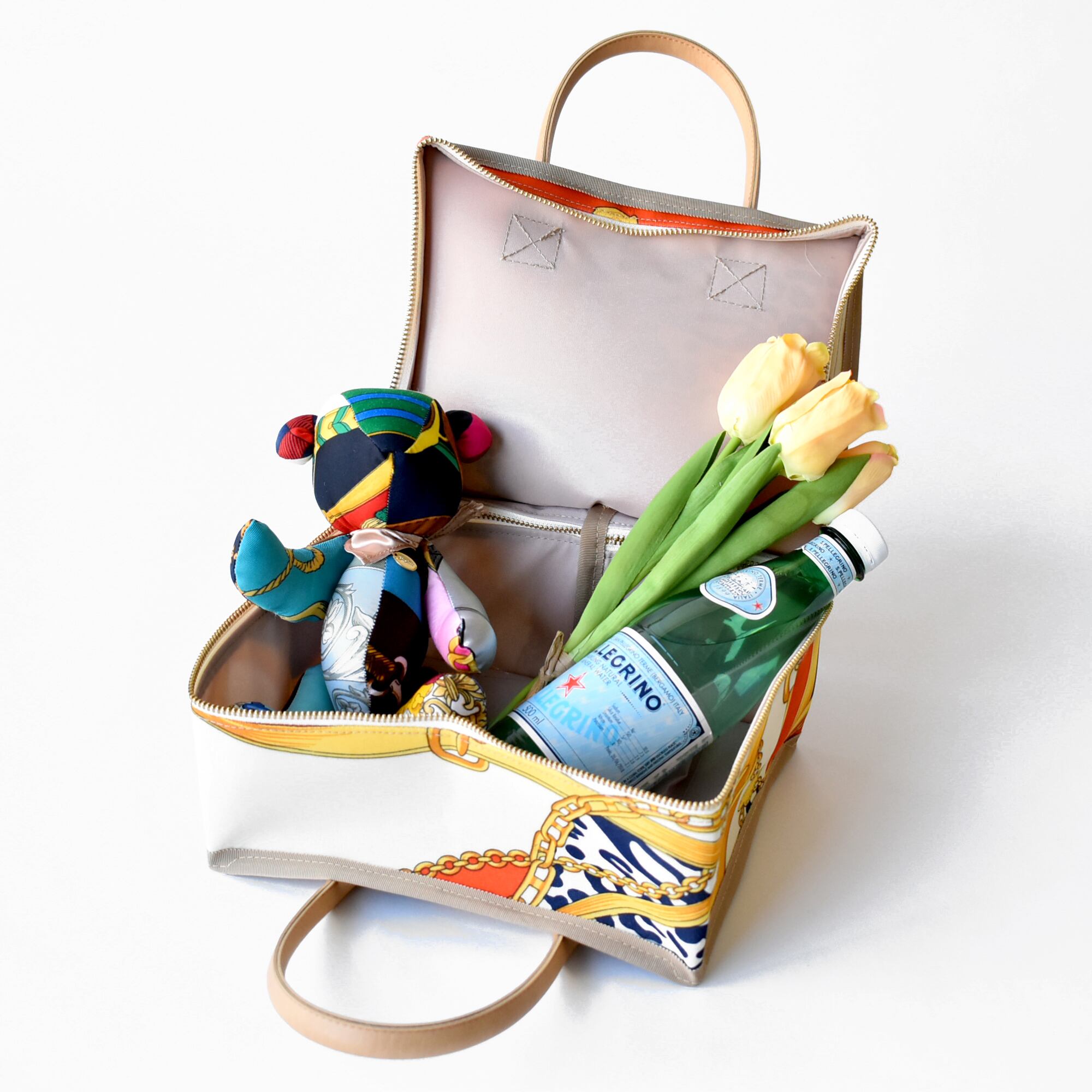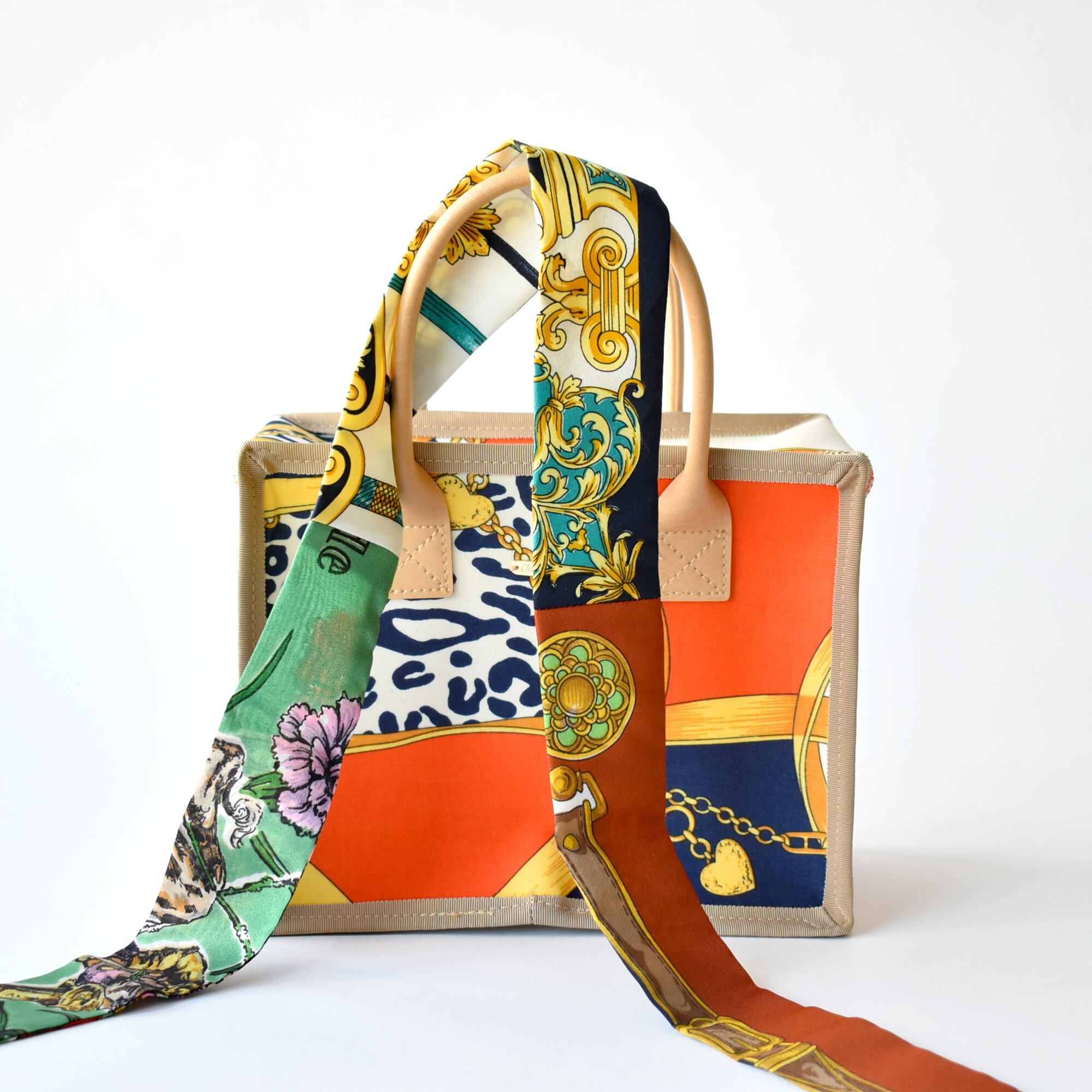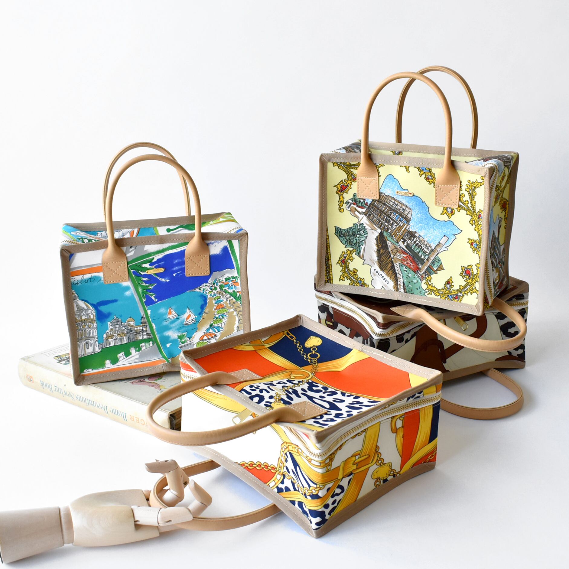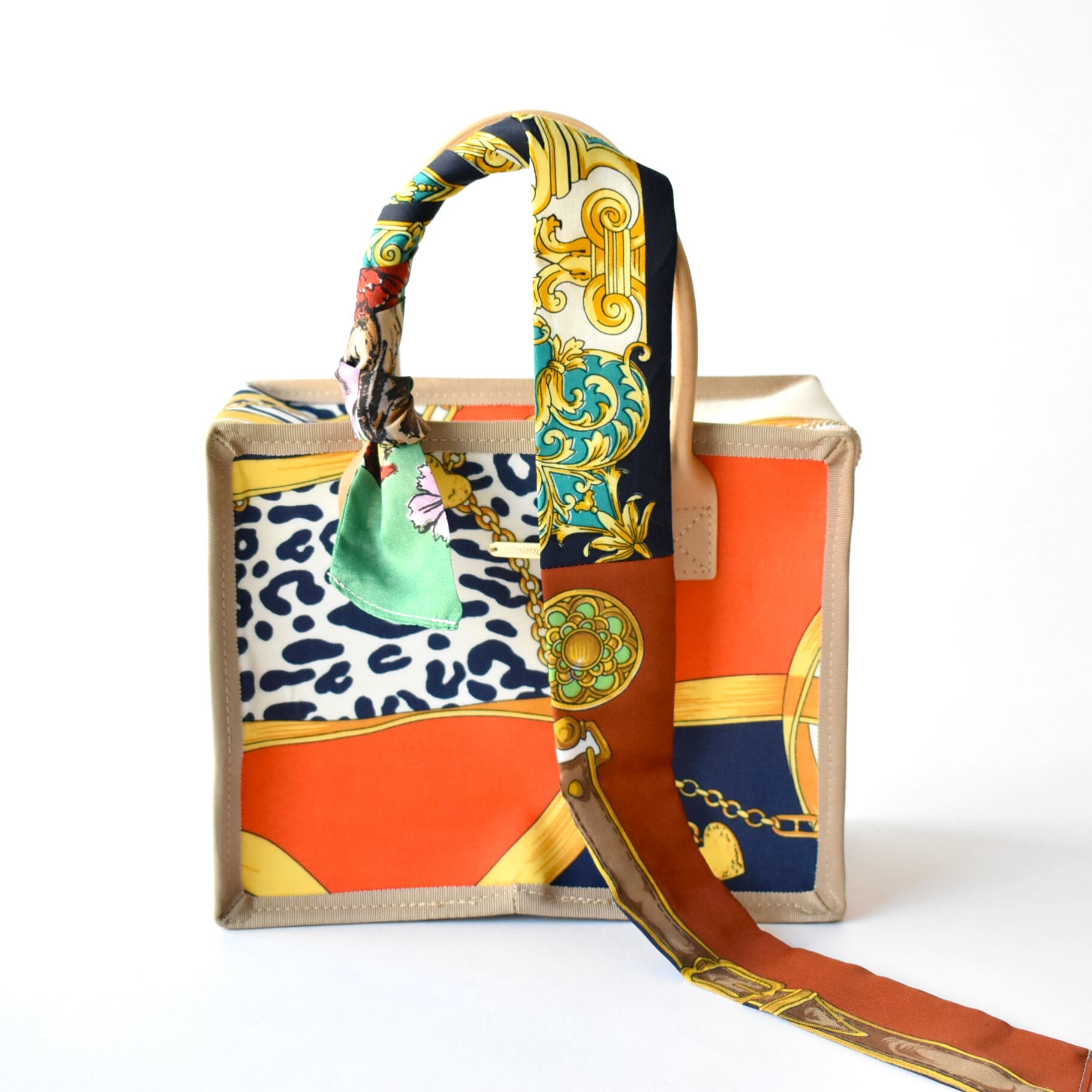 ヴィンテージスカーフをリメイクしたボックス型のバッグは
