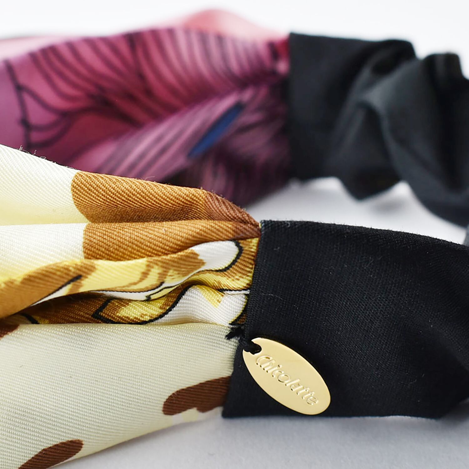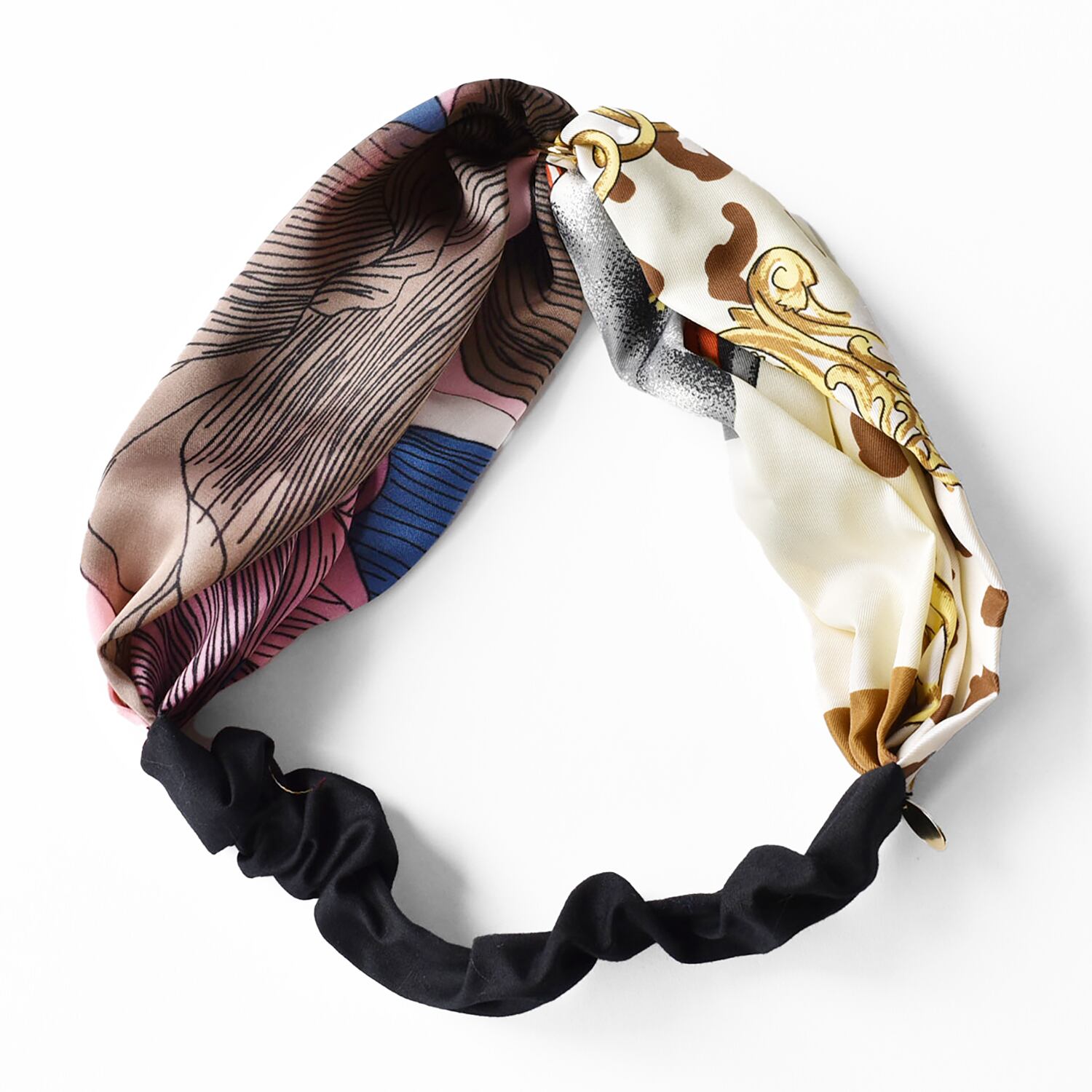 異なるスカーフを組み合わせ、真ん中にリングがついたデザインです。