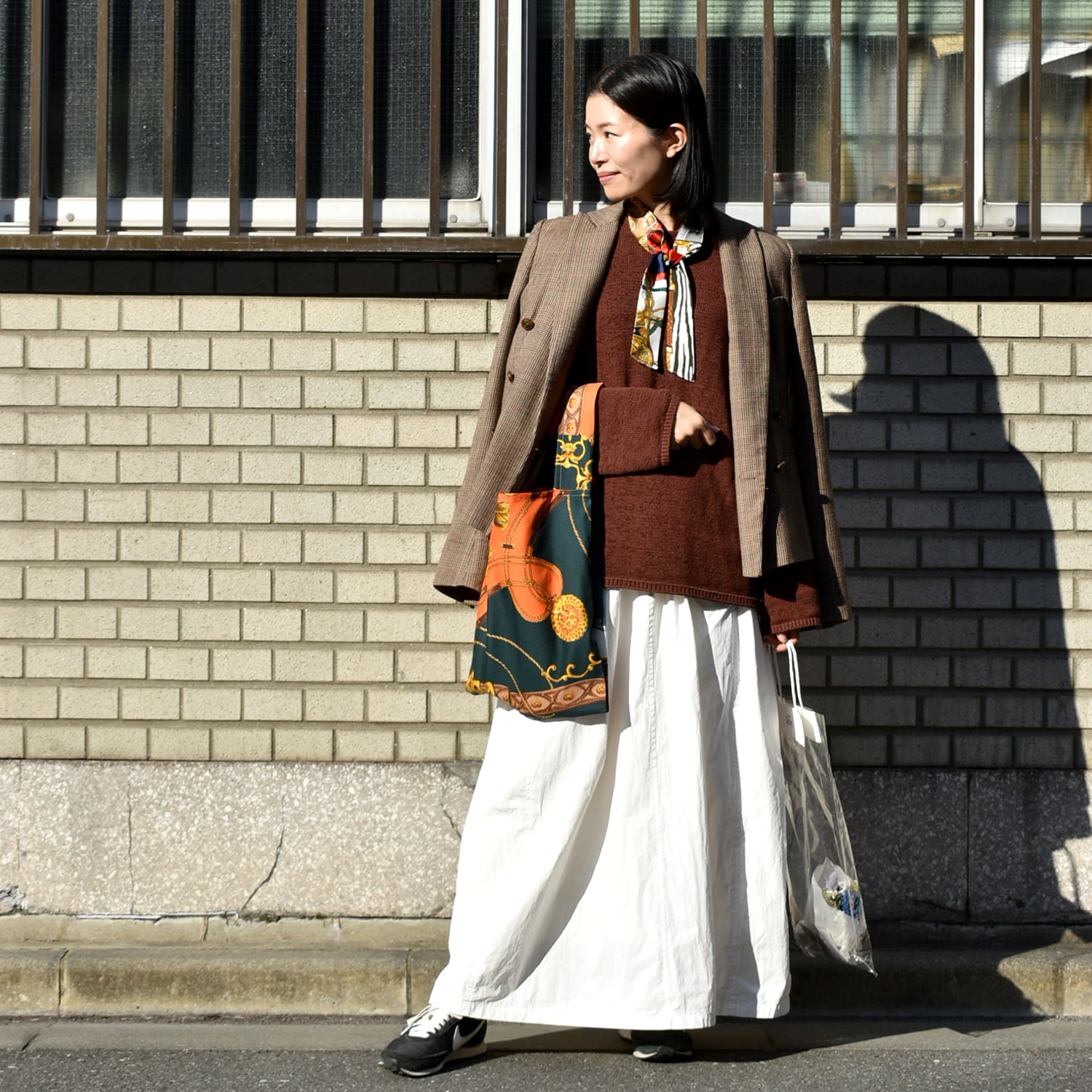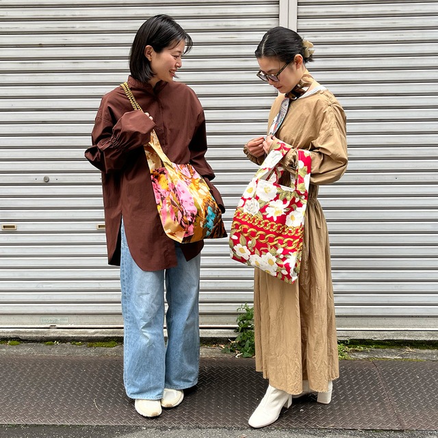 ヴィンテージスカーフが高級感たっぷりなマルシェバッグ。