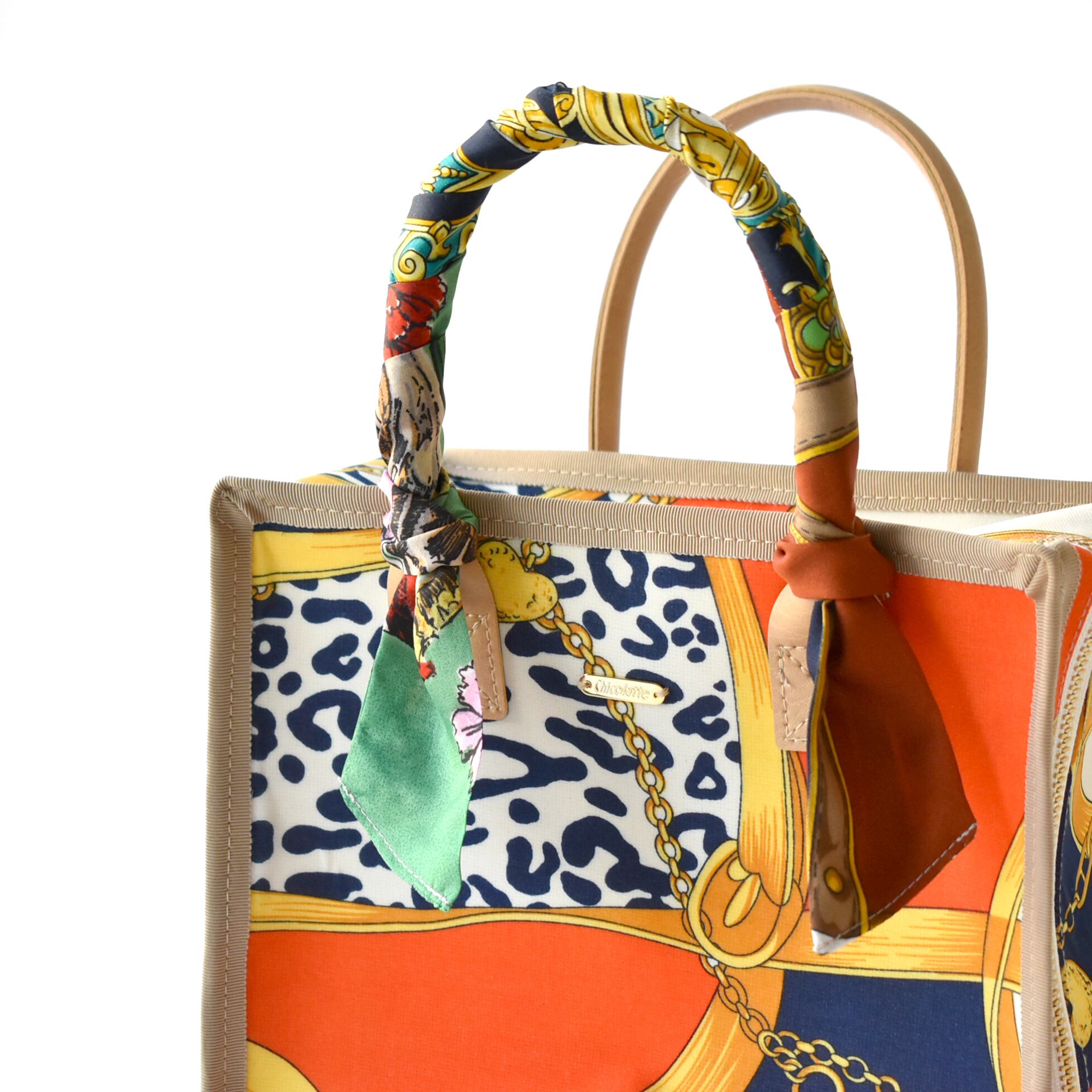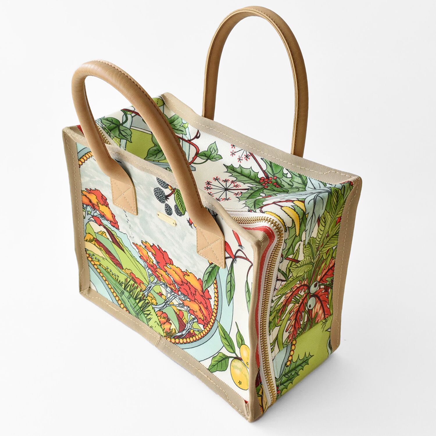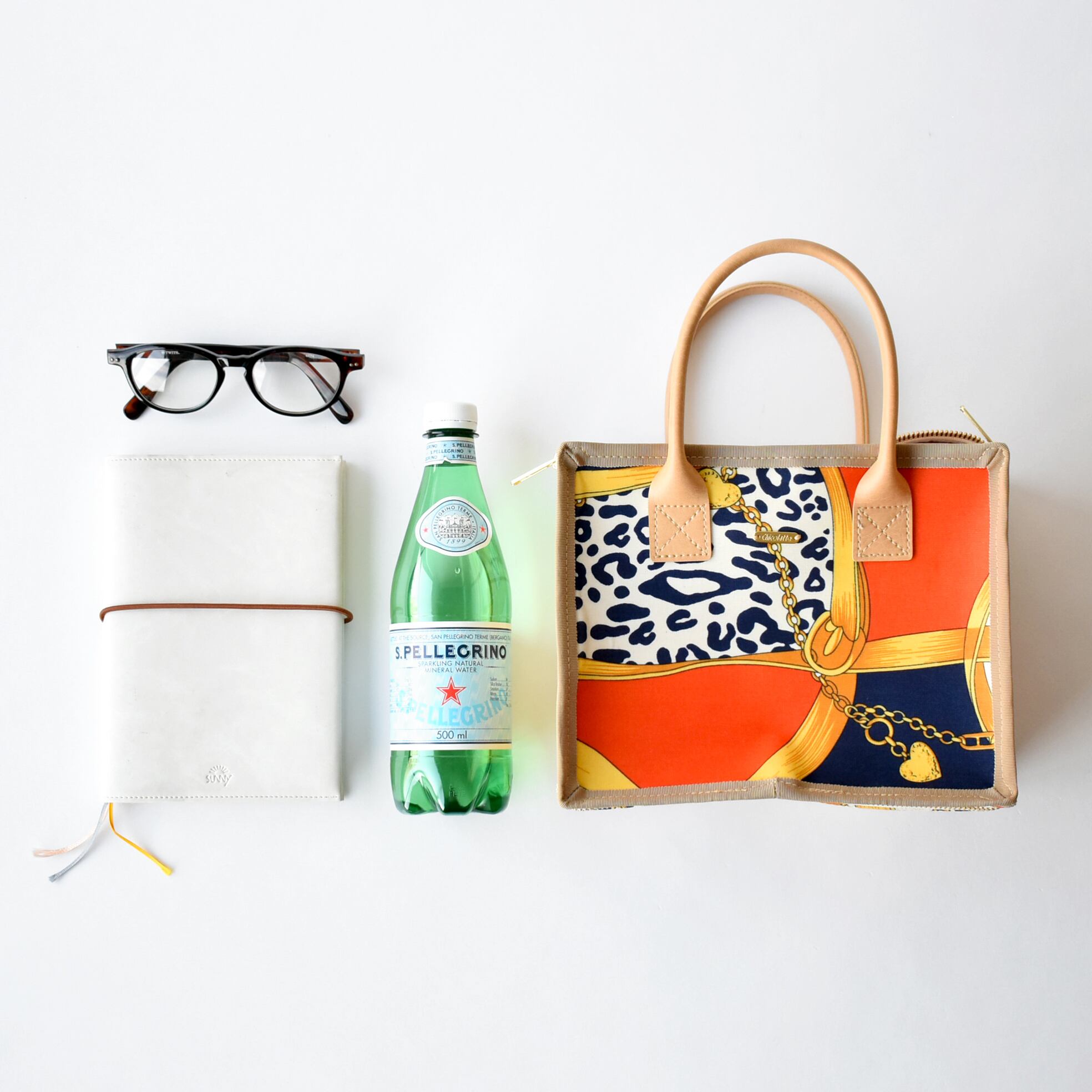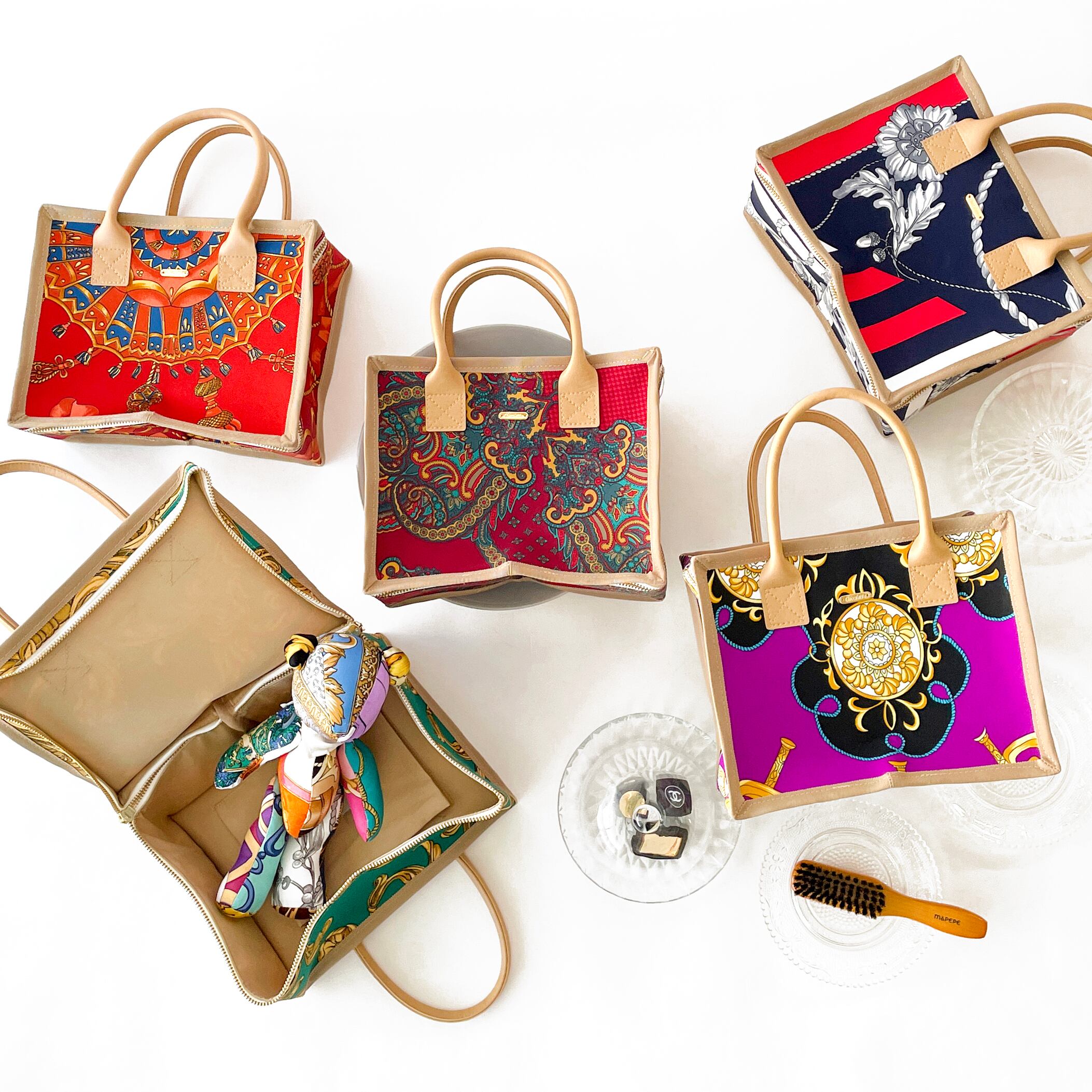 ヴィンテージスカーフをリメイクしたボックス型のバッグは