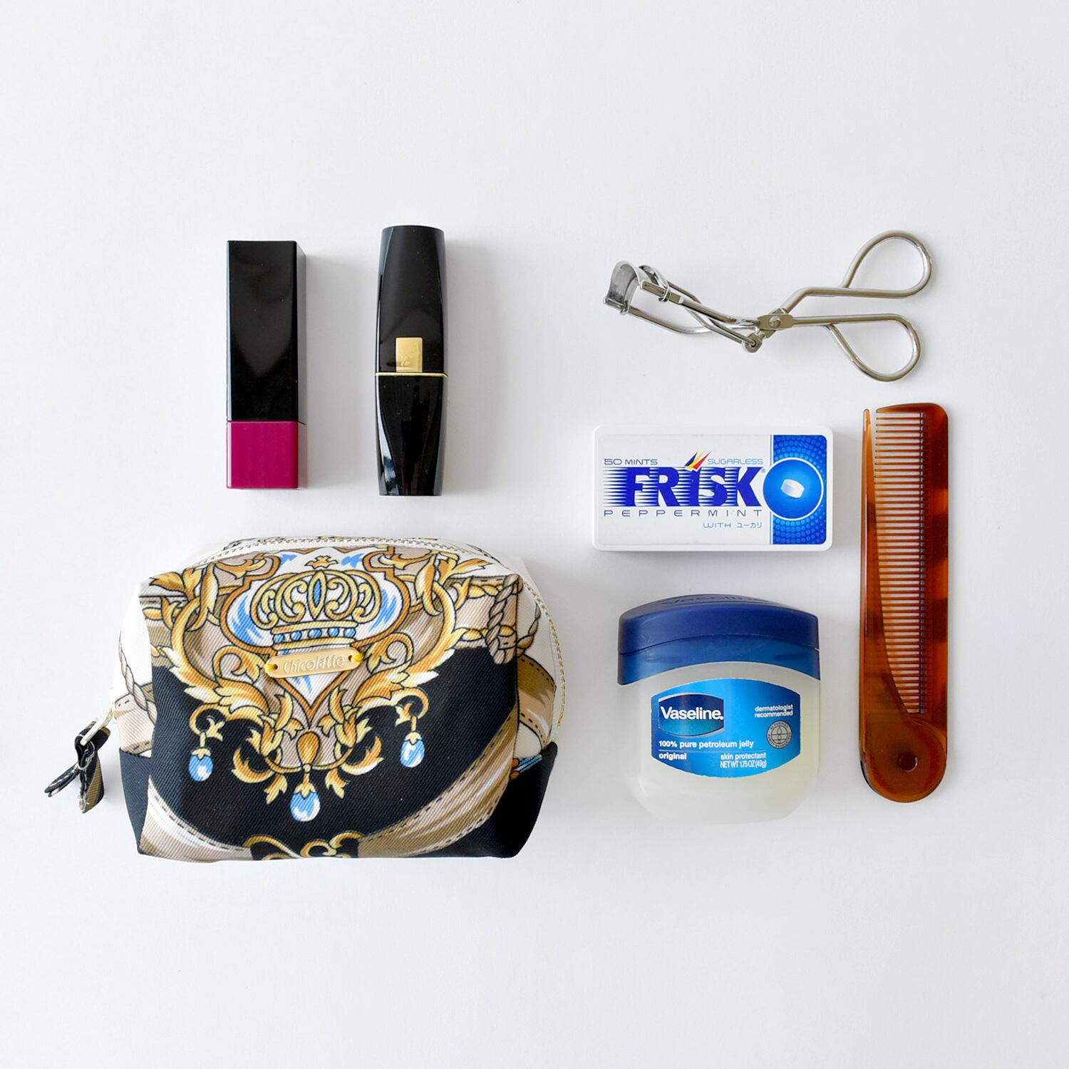 リップ、口紅とコンパクトファンデーション、ミニコロンなど適度にコスメが入り、