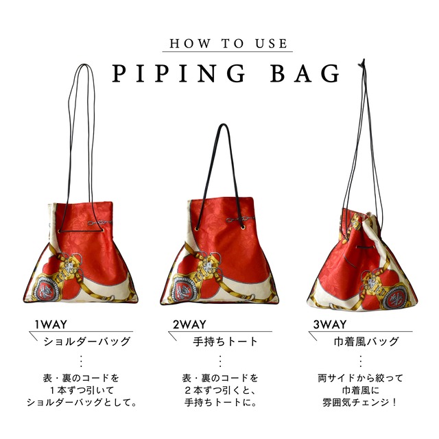 手持ちトート、ショルダーバッグ、巾着バッグとして