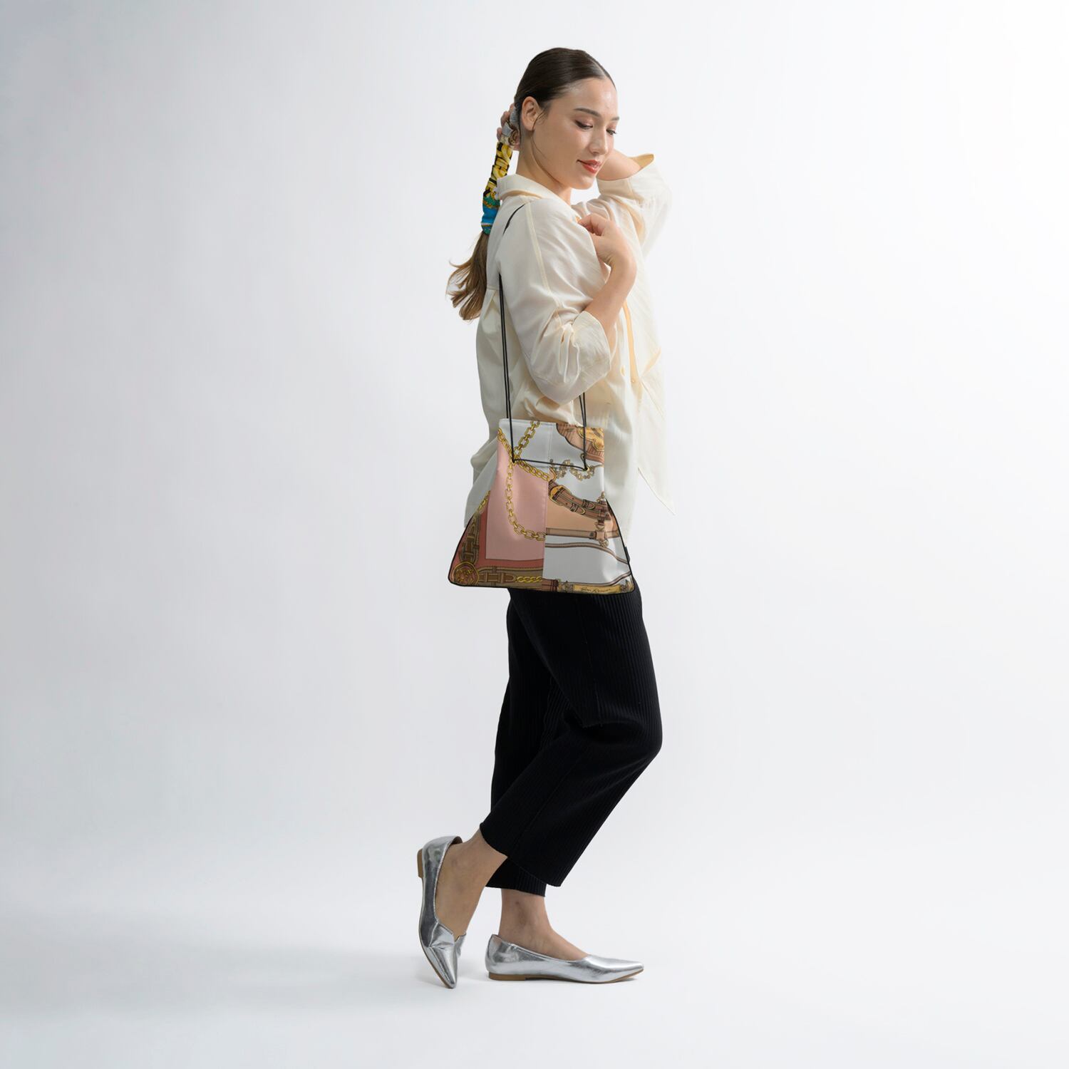 ウォッシュデニムと馬柄のヴィンテージスカーフ柄のコーディネート。