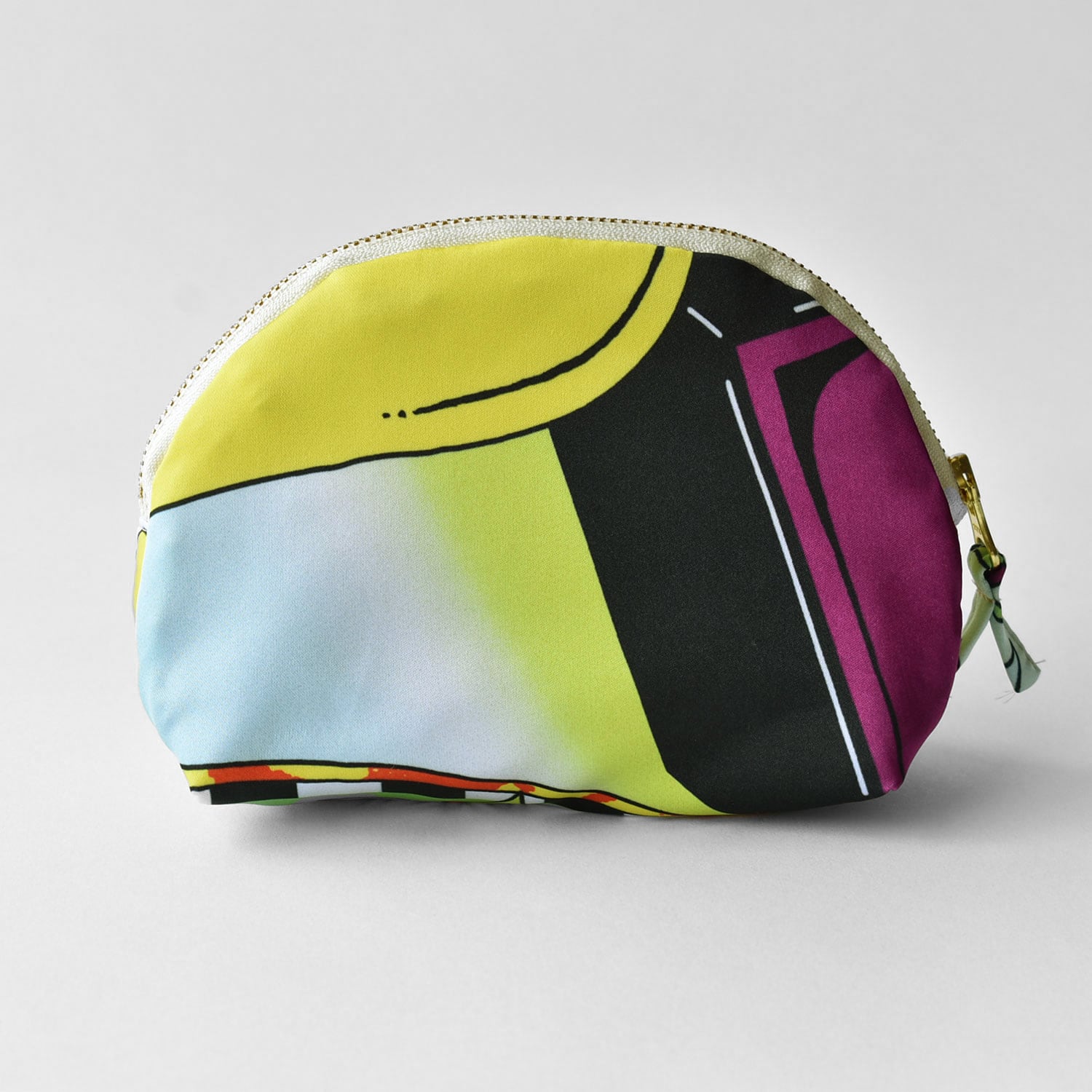 ファスナーがラウンド型に開く人気のポーチはアイテムの出し入れがしやすく、コンパクトでバッグの中でもかさばりません。