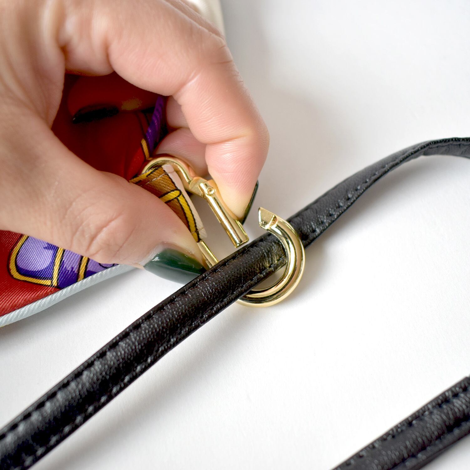 (カラビナ(金具フック)からショルダー部分を外してショルダー部分を結ぶ)