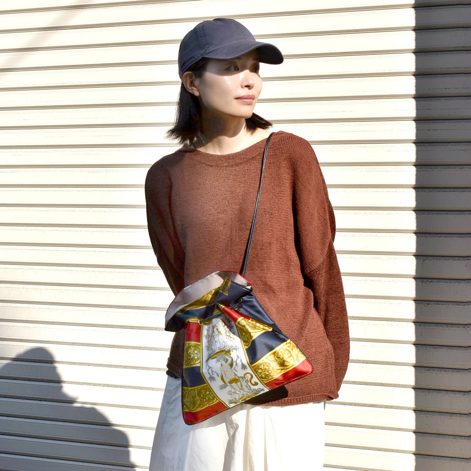 ウォッシュデニムと馬柄のヴィンテージスカーフ柄のコーディネート。