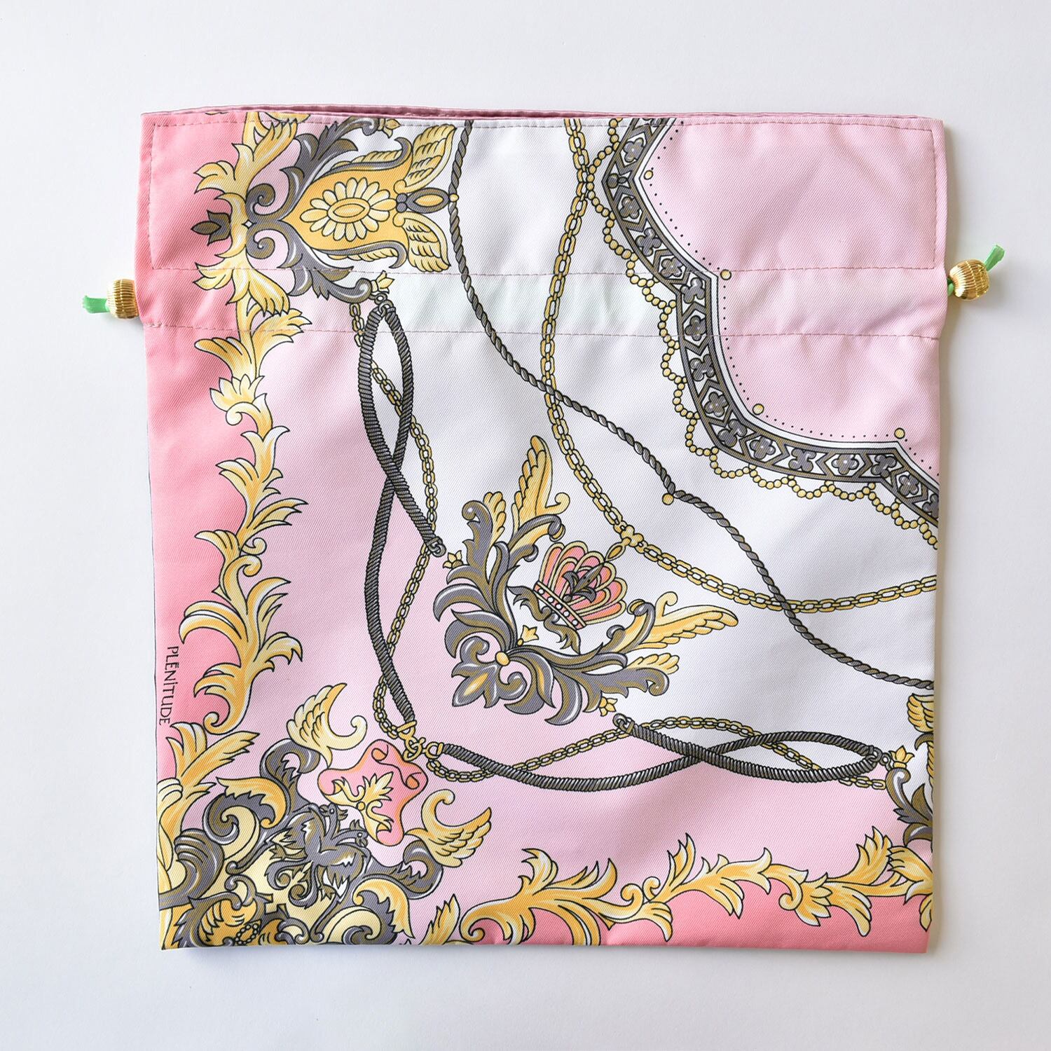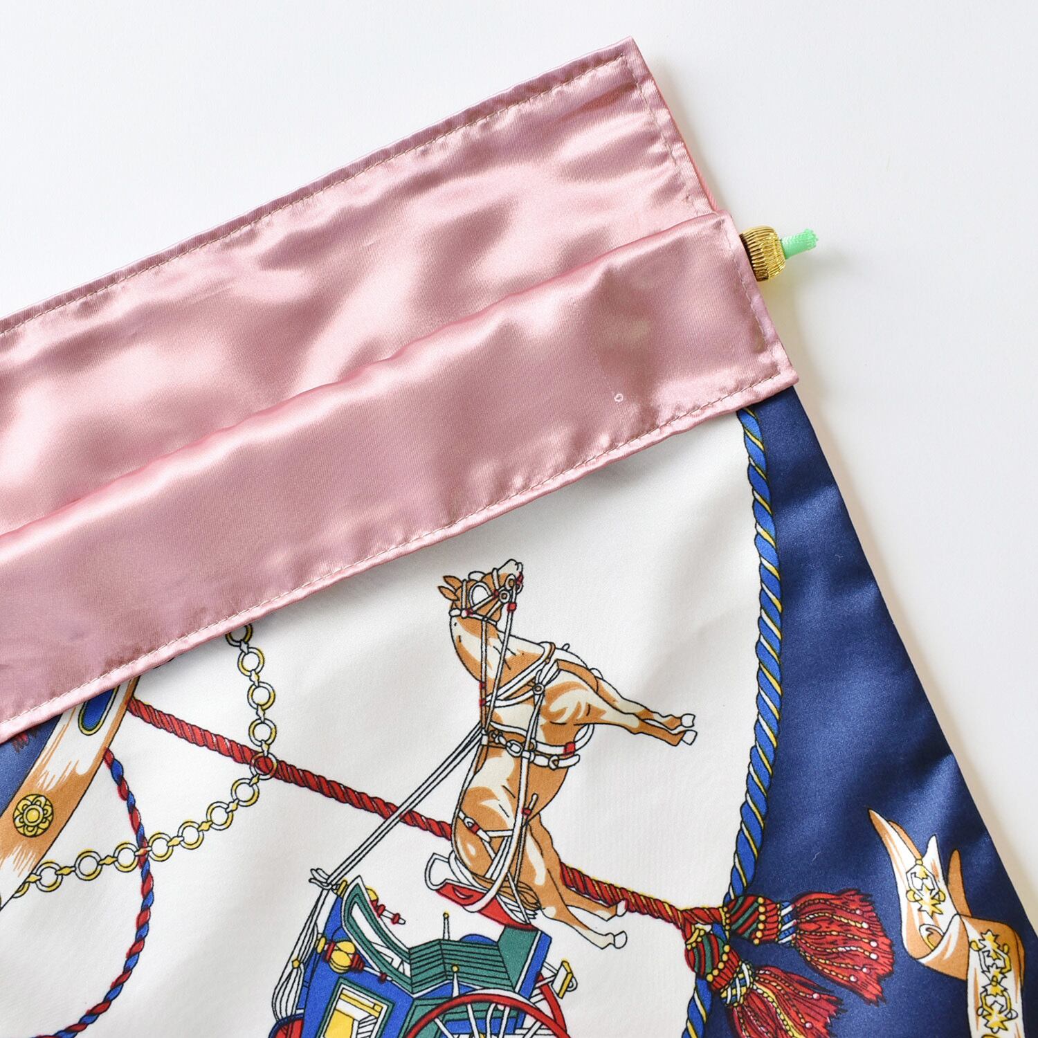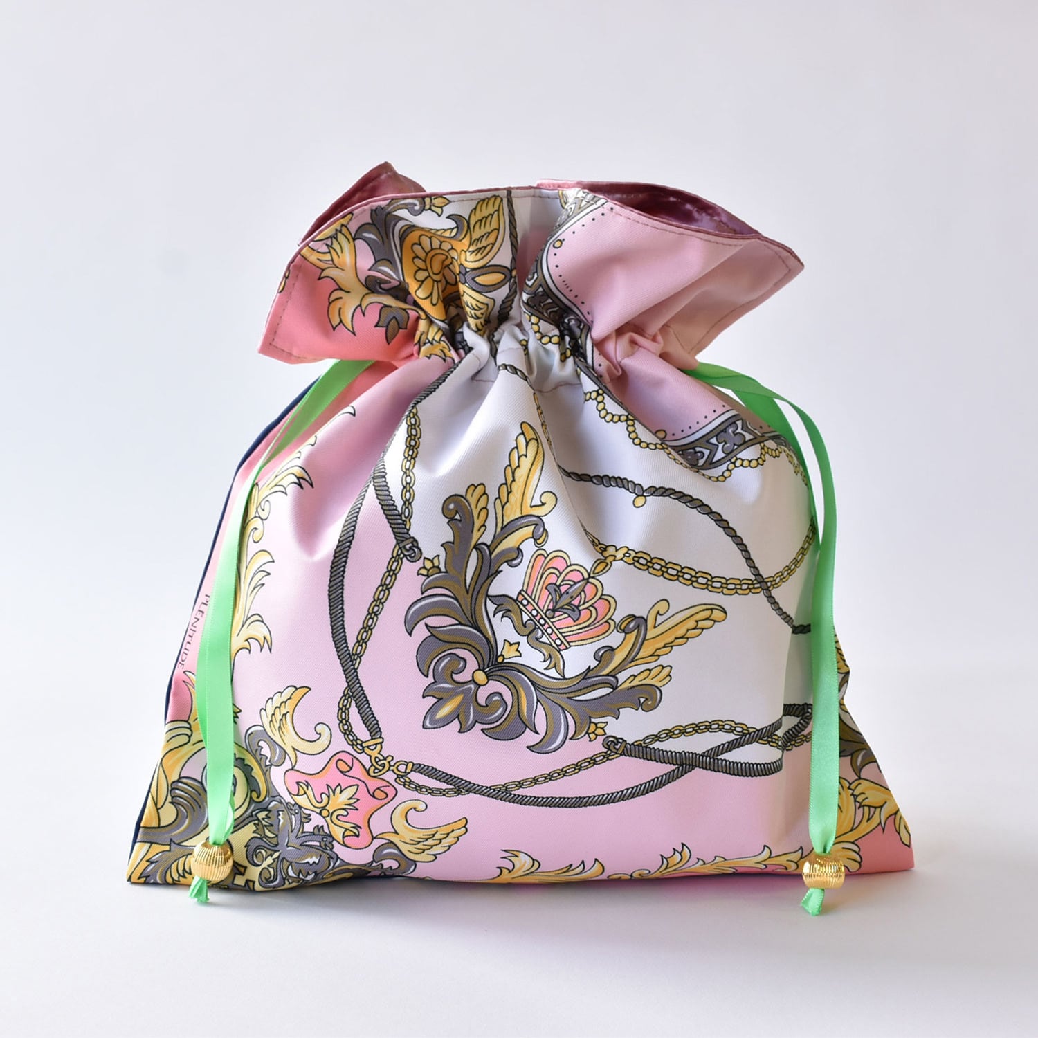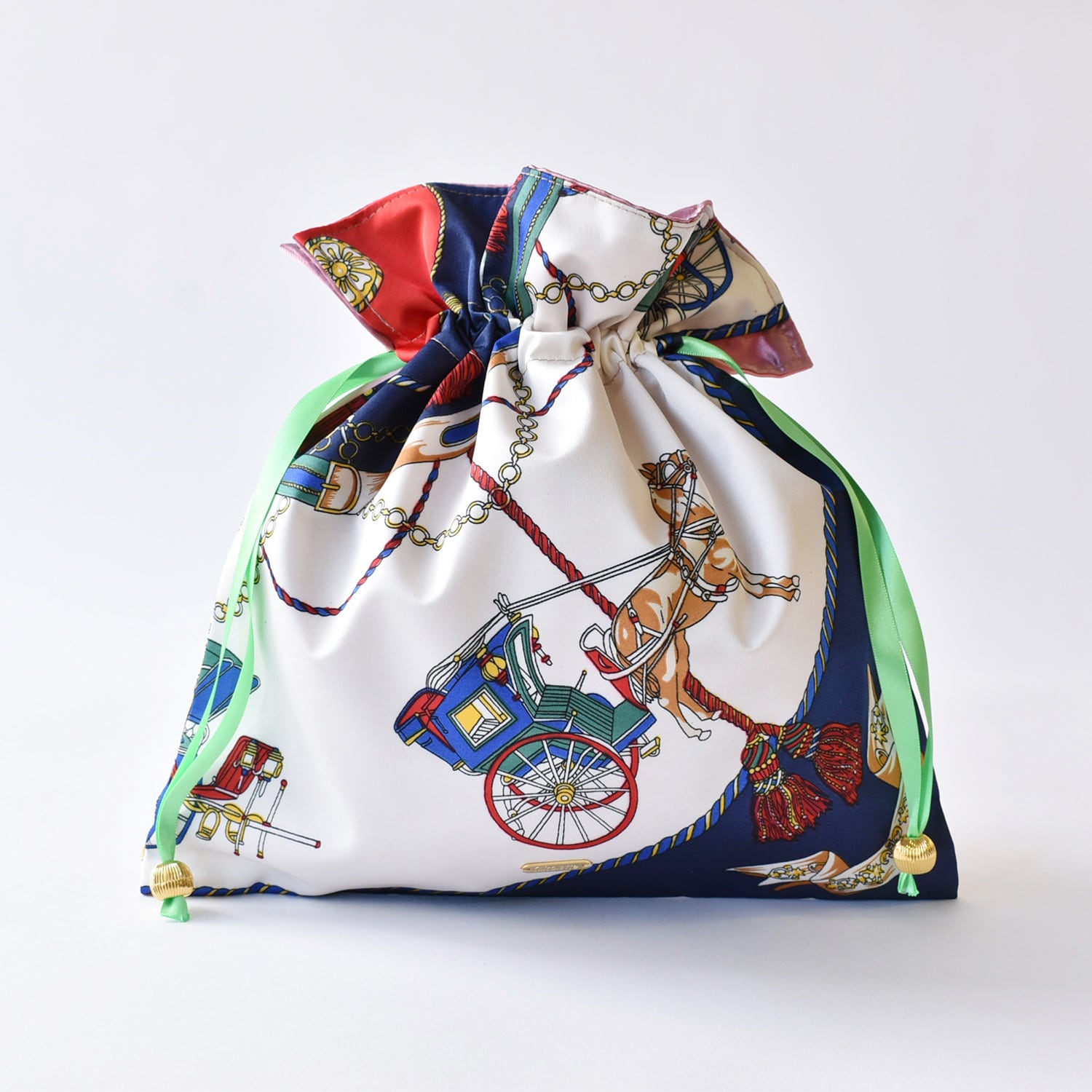 表生地は2種類のスカーフを使用しており、スカーフの切替が楽しい一点もの巾着。
