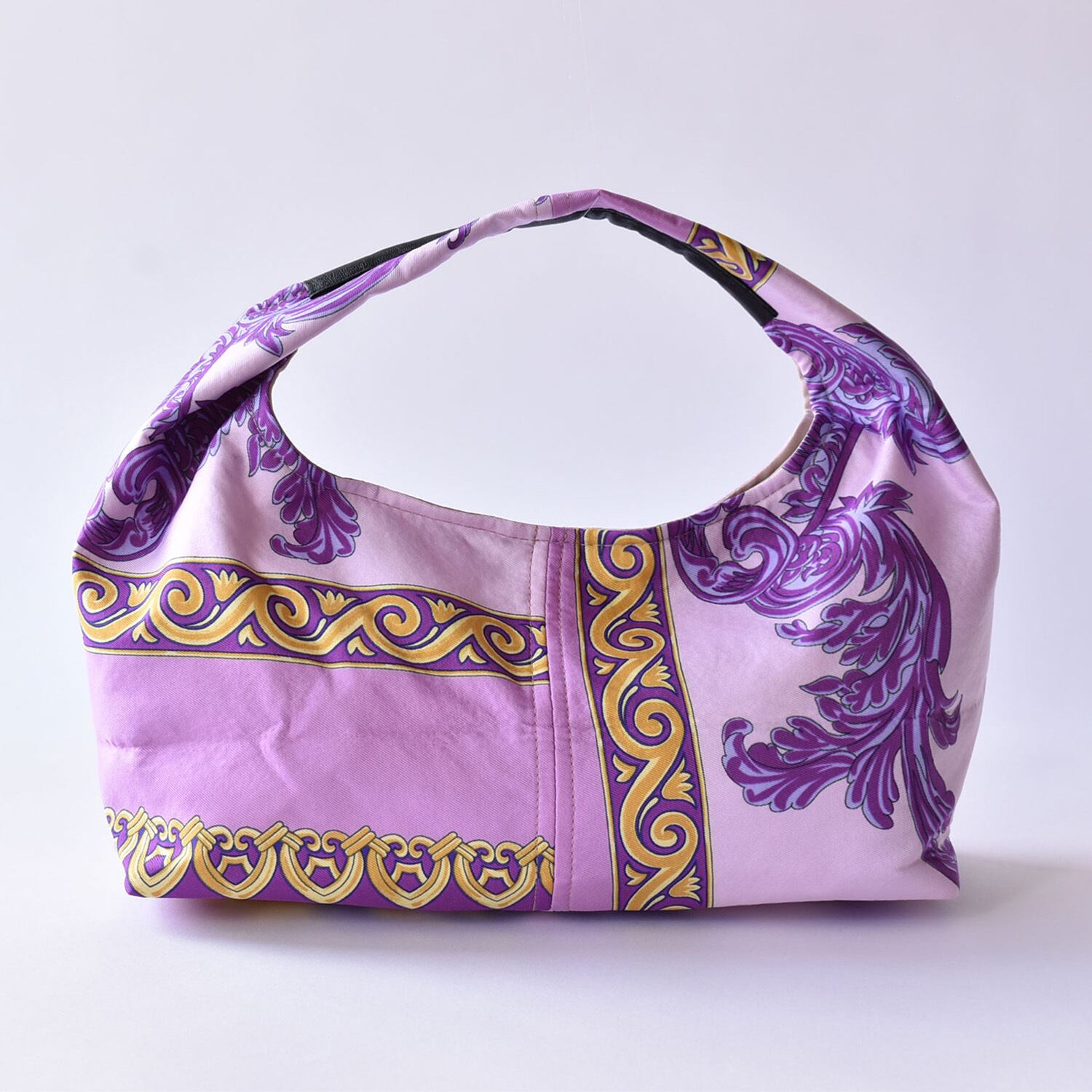 スカーフ素材で柔らかく、持ち手部分は合皮でパイピングされているので持ち心地◎
