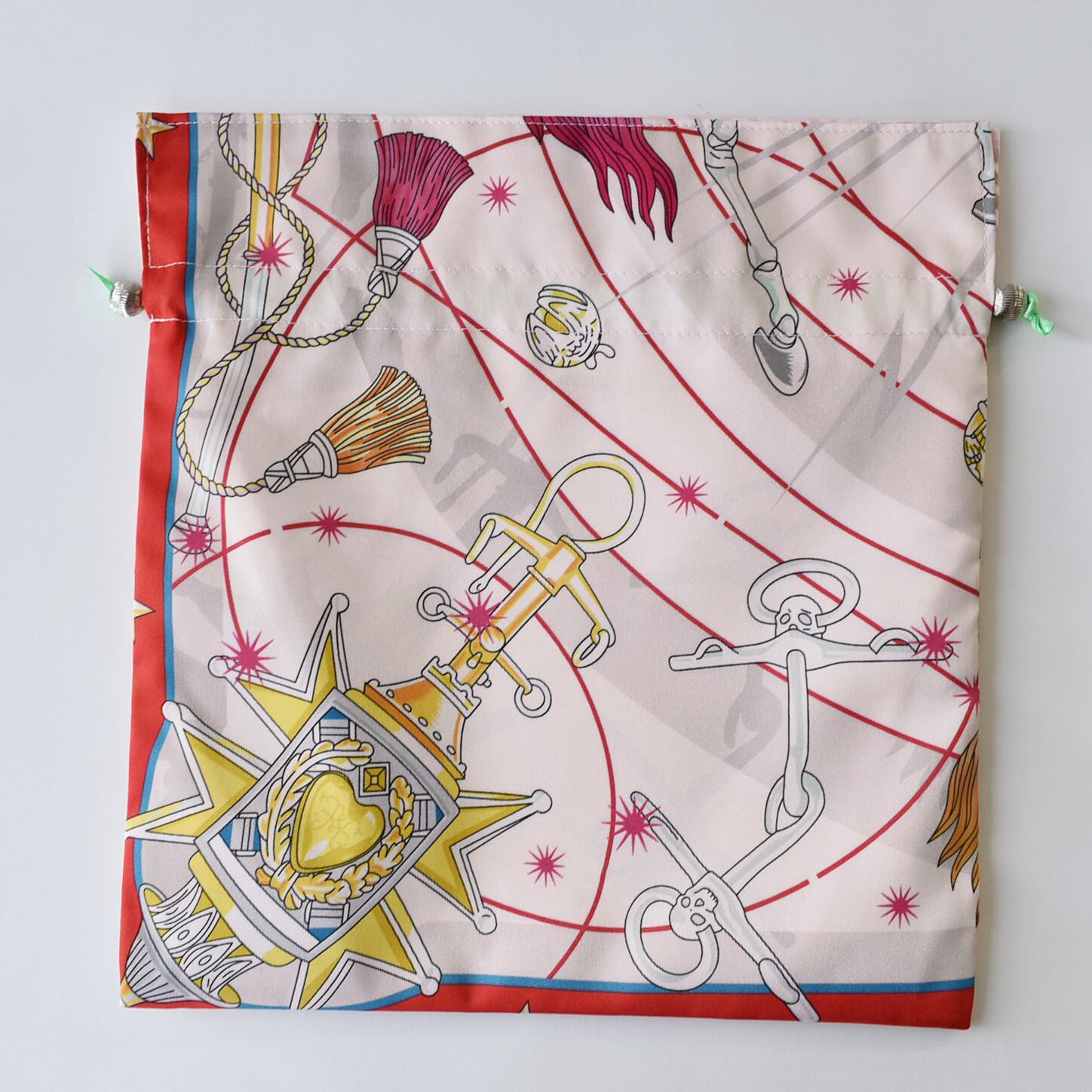 表生地は2種類のスカーフを使用しており、スカーフの切替が楽しい一点もの巾着。