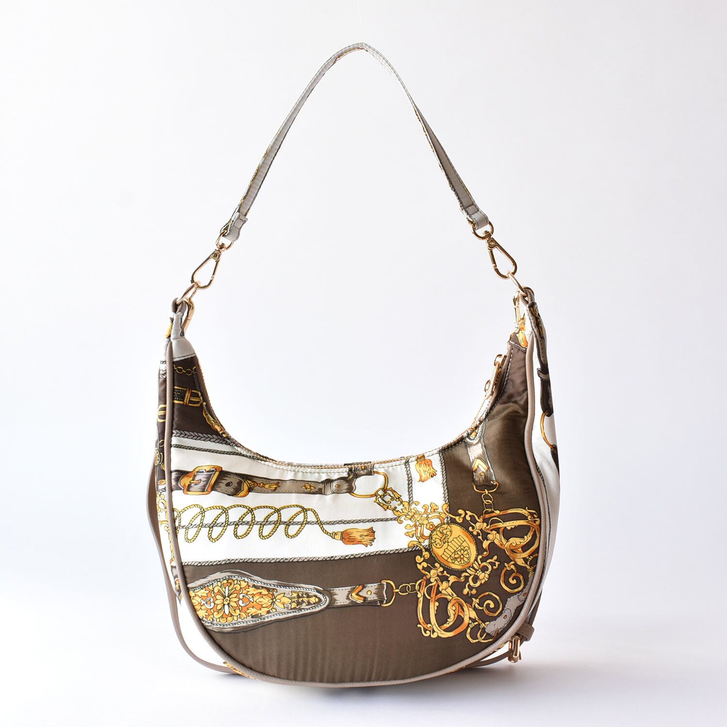 ショルダー2本のうち短い方はボディと同じスカーフで、長い方はアクセントのパイピングなどに使用のエコレザーと同じ素材でお作りしました。