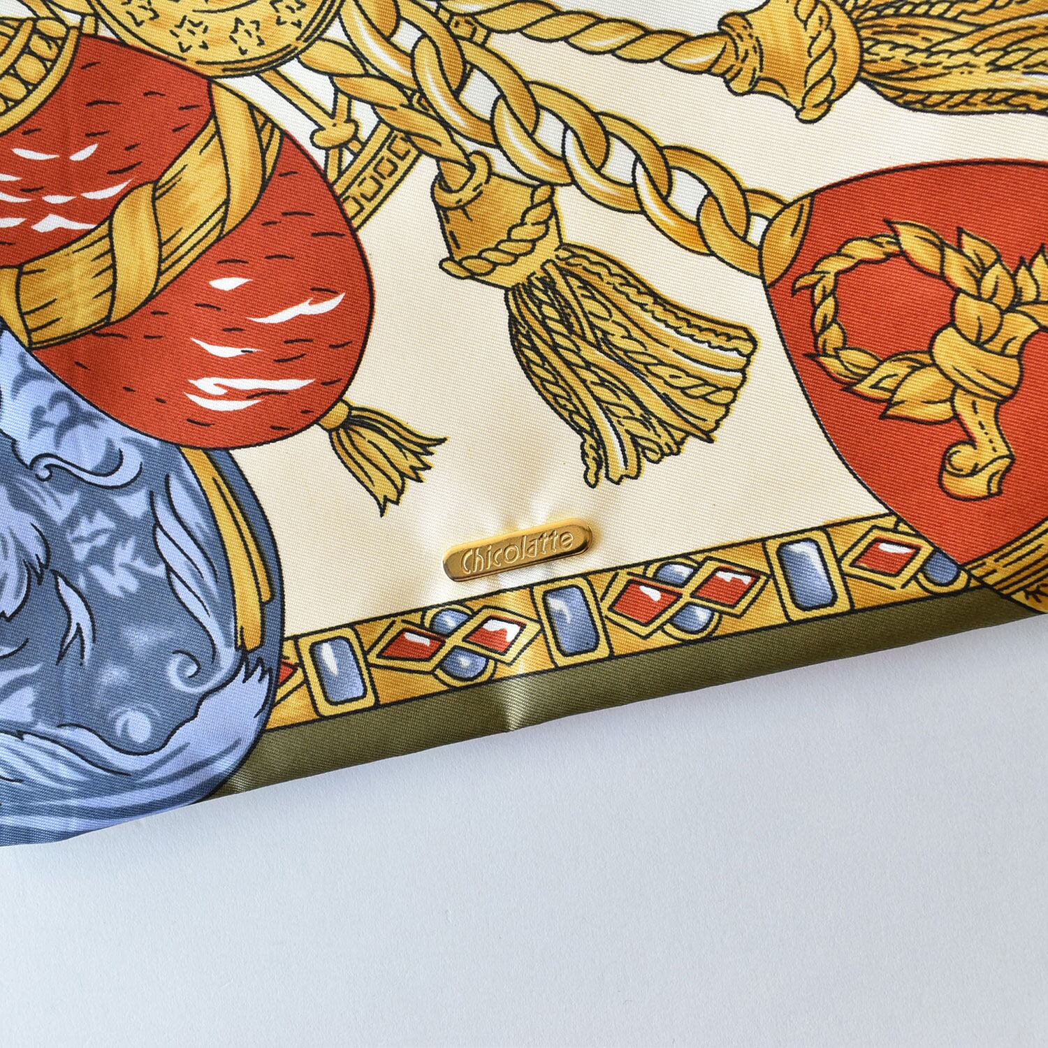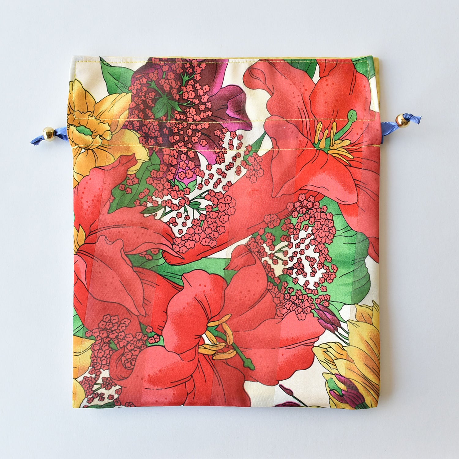 表生地は2種類のスカーフを使用しており、スカーフの切替が楽しい一点もの巾着。