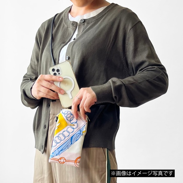 シンプルなスタイリングのアクセントにおすすめのスマホポシェット。