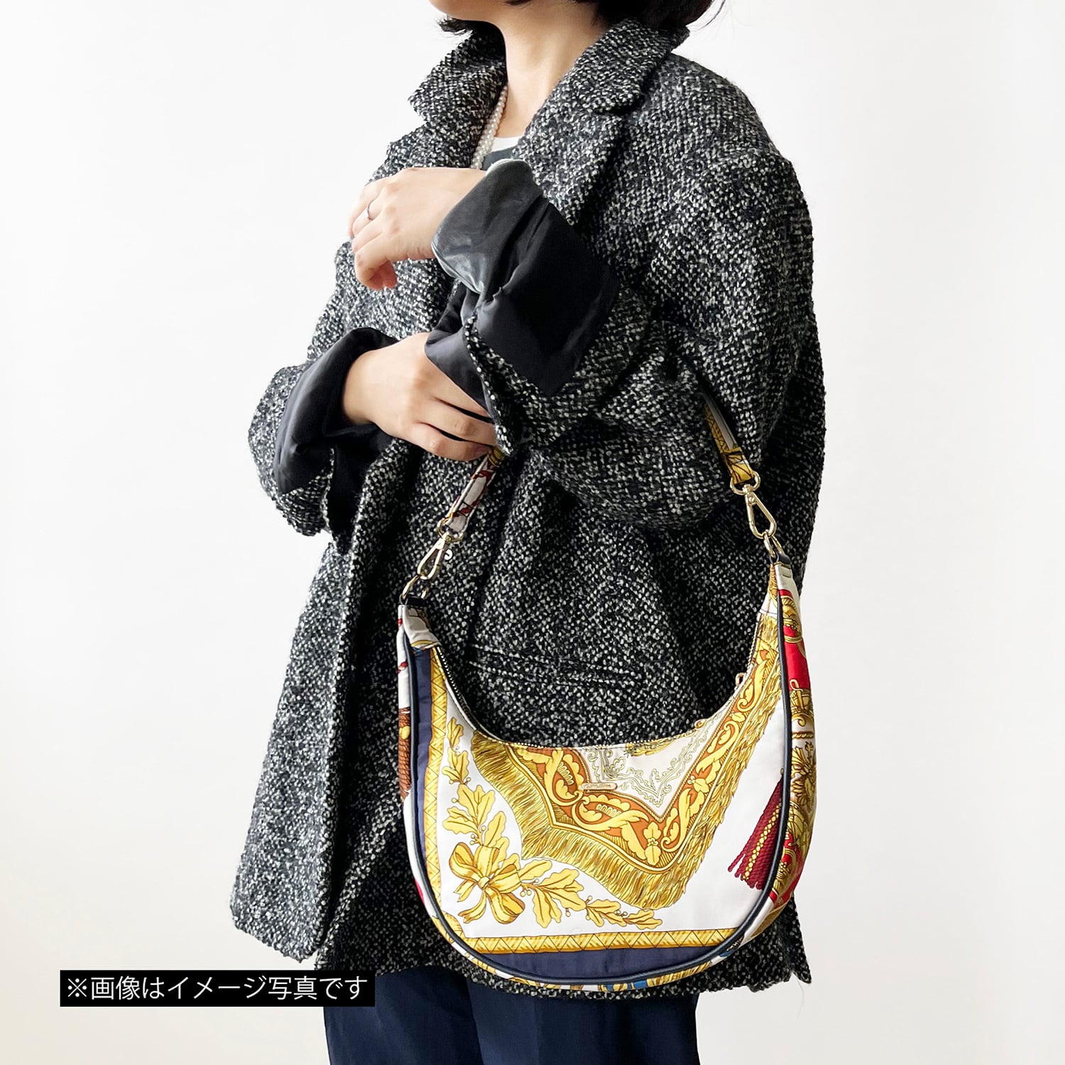 ショルダー2本のうち短い方はボディと同じスカーフで、長い方はアクセントのパイピングなどに使用のエコレザーと同じ素材でお作りしました。