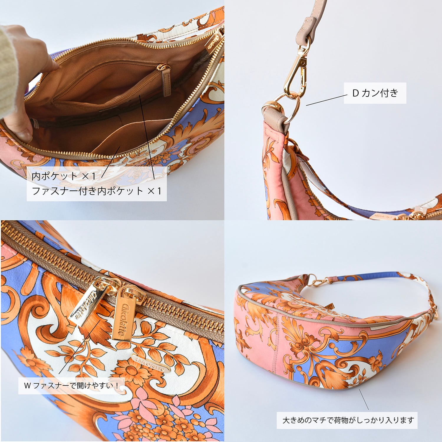 ほどよい収納力を備えた使い勝手のいい三日月型のボディに、2種類のストラップでどんなシーンでも使いやすいラウンドショルダー。