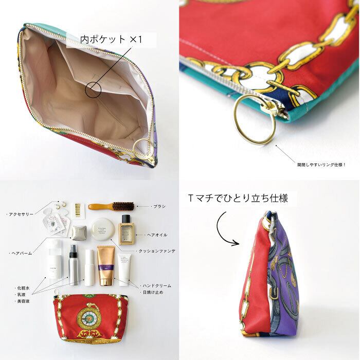 化粧水やヘアオイルなど、大きめのものも入る便利なポーチ。