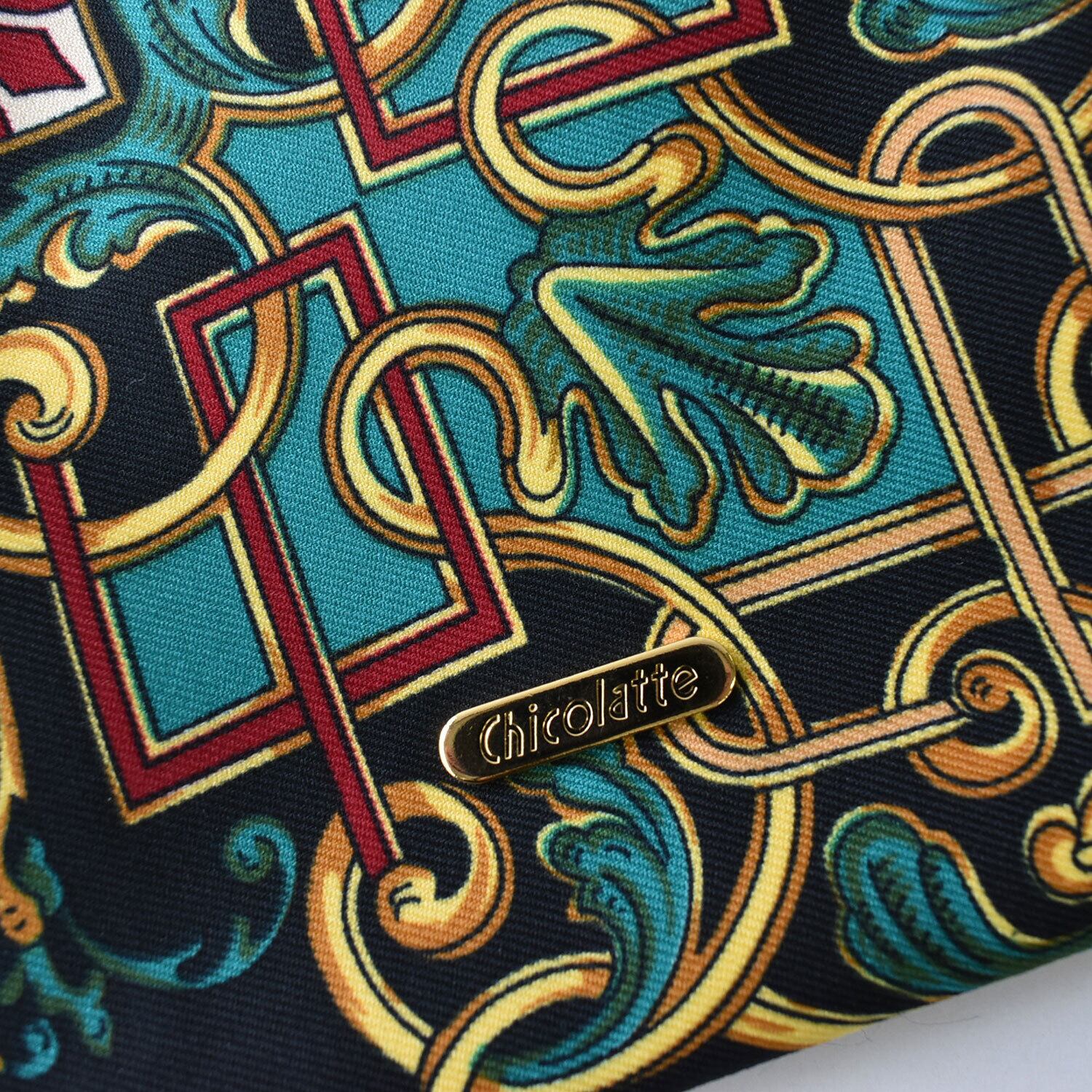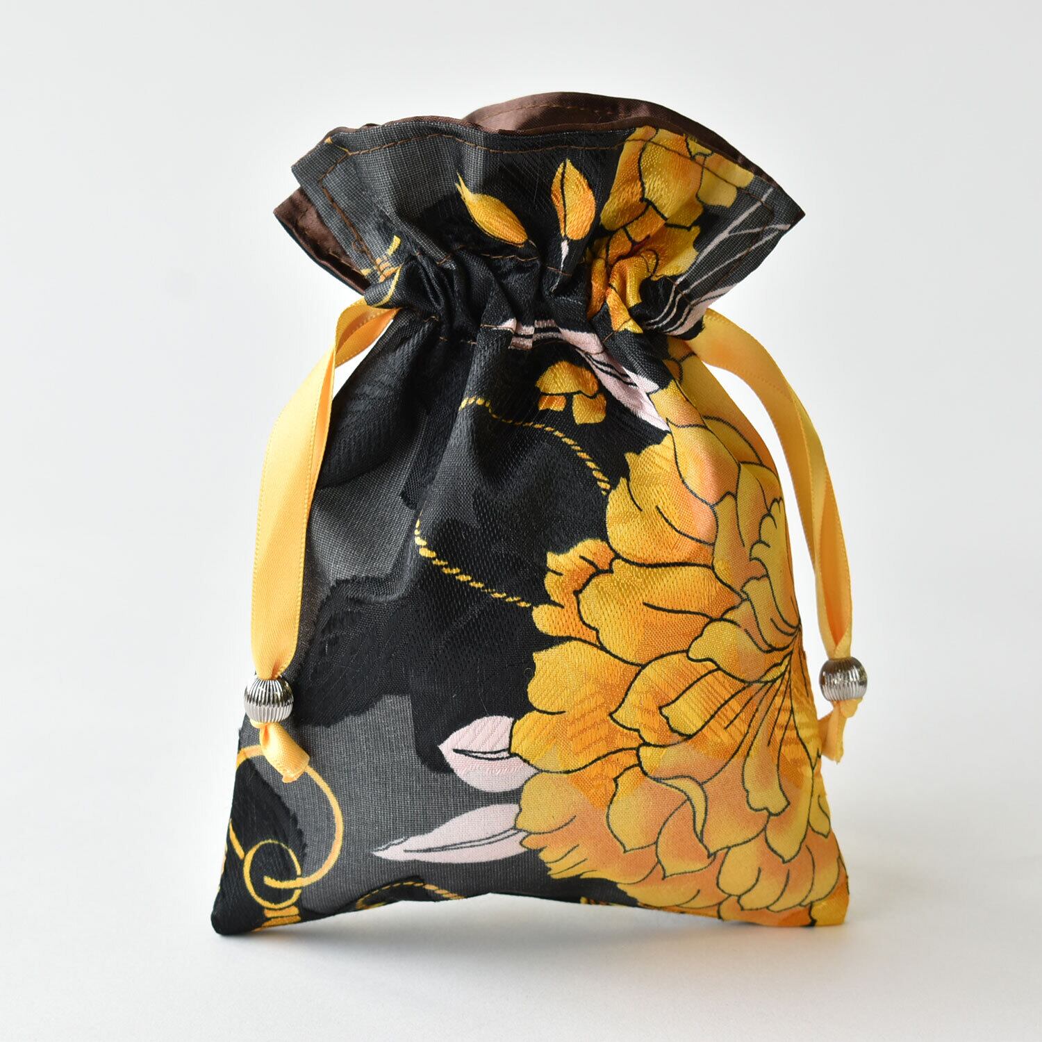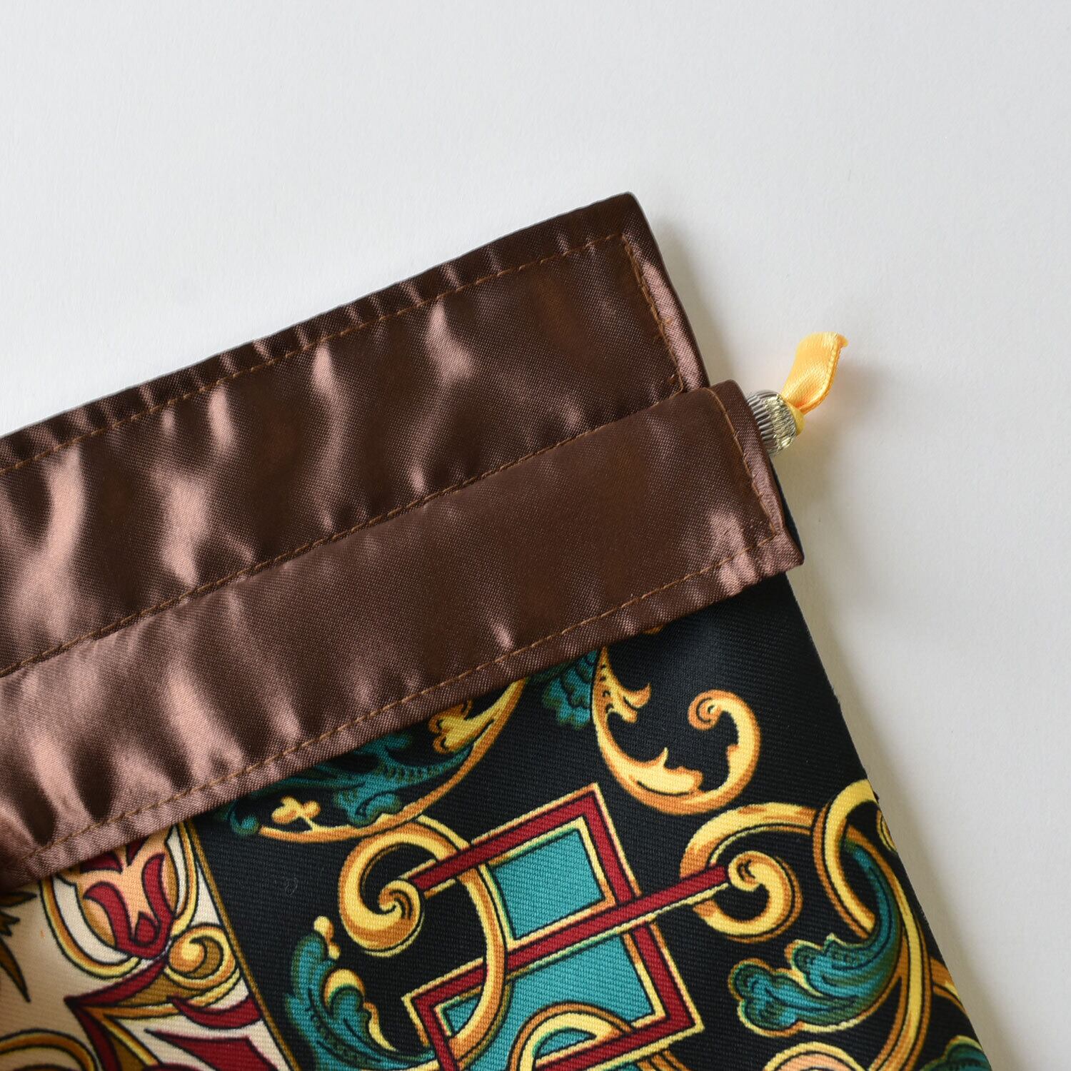 表生地は2種類のスカーフを使用しており、スカーフの切替が楽しい一点もの巾着。
