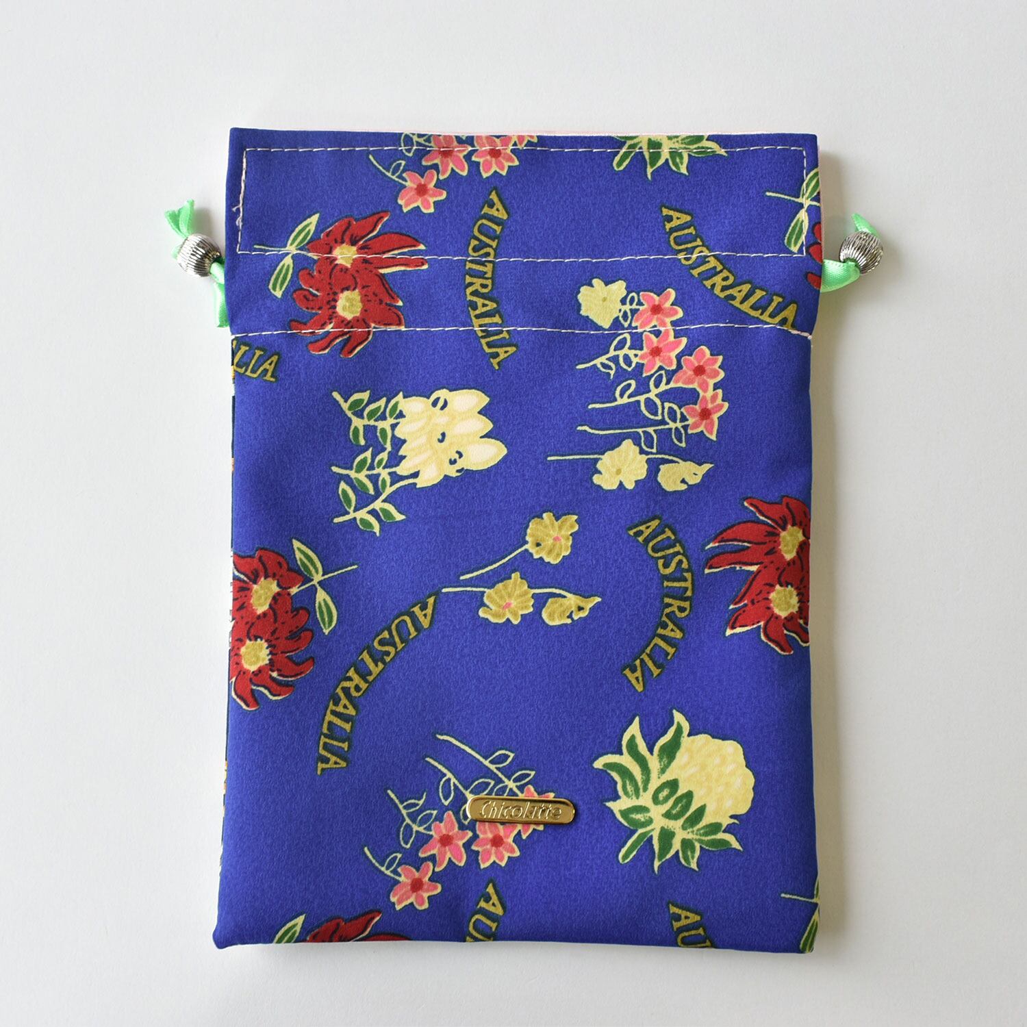 表生地は2種類のスカーフを使用しており、スカーフの切替が楽しい一点もの巾着。