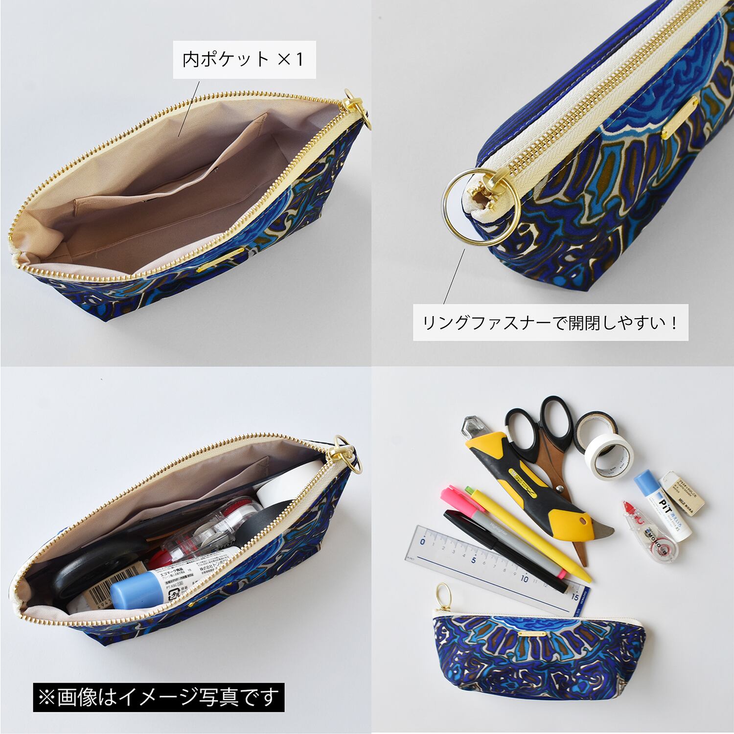 リングファスナーで開けやすい、マチが大きめの横長ポーチ。