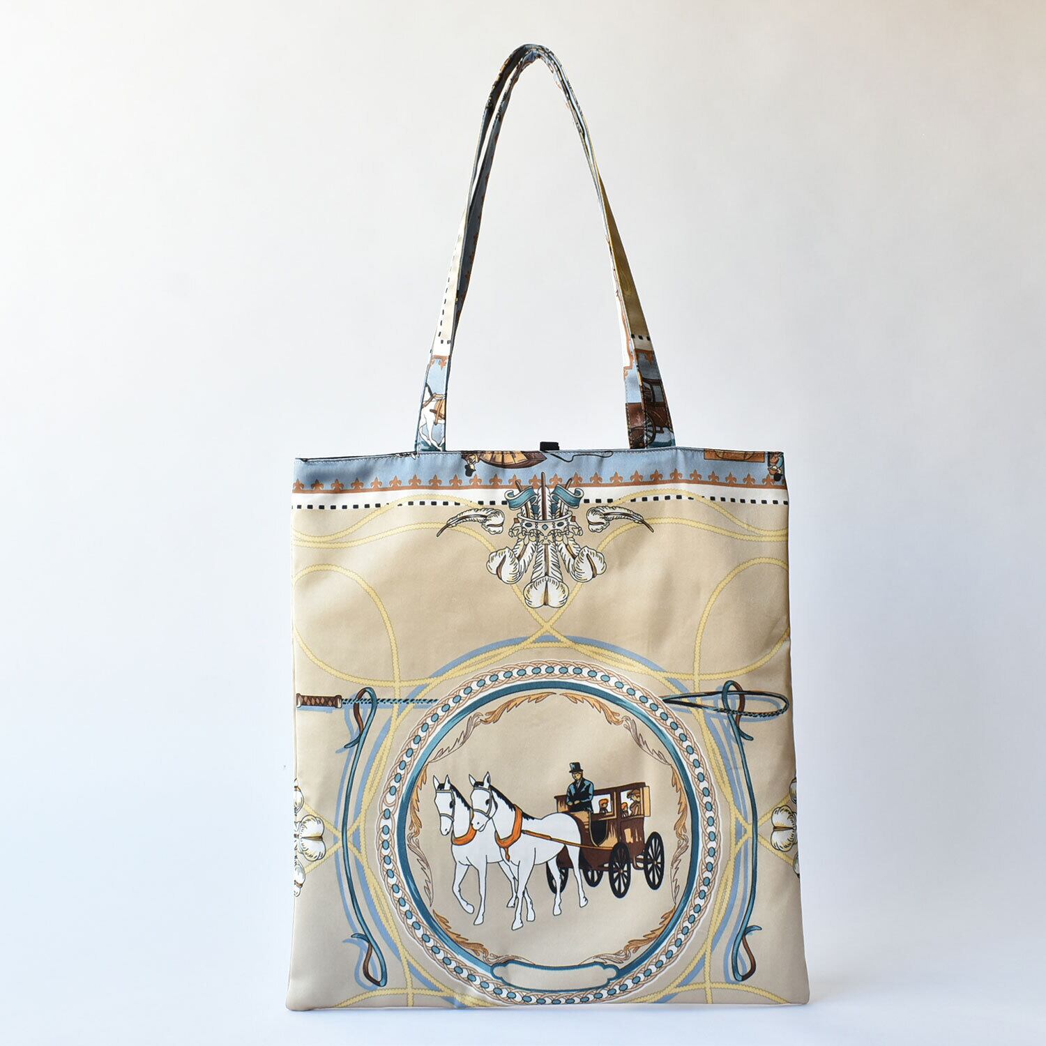 スカーフ裏に柔らかい芯地を合わせて折畳しやすいタイプのトートバッグとなります。