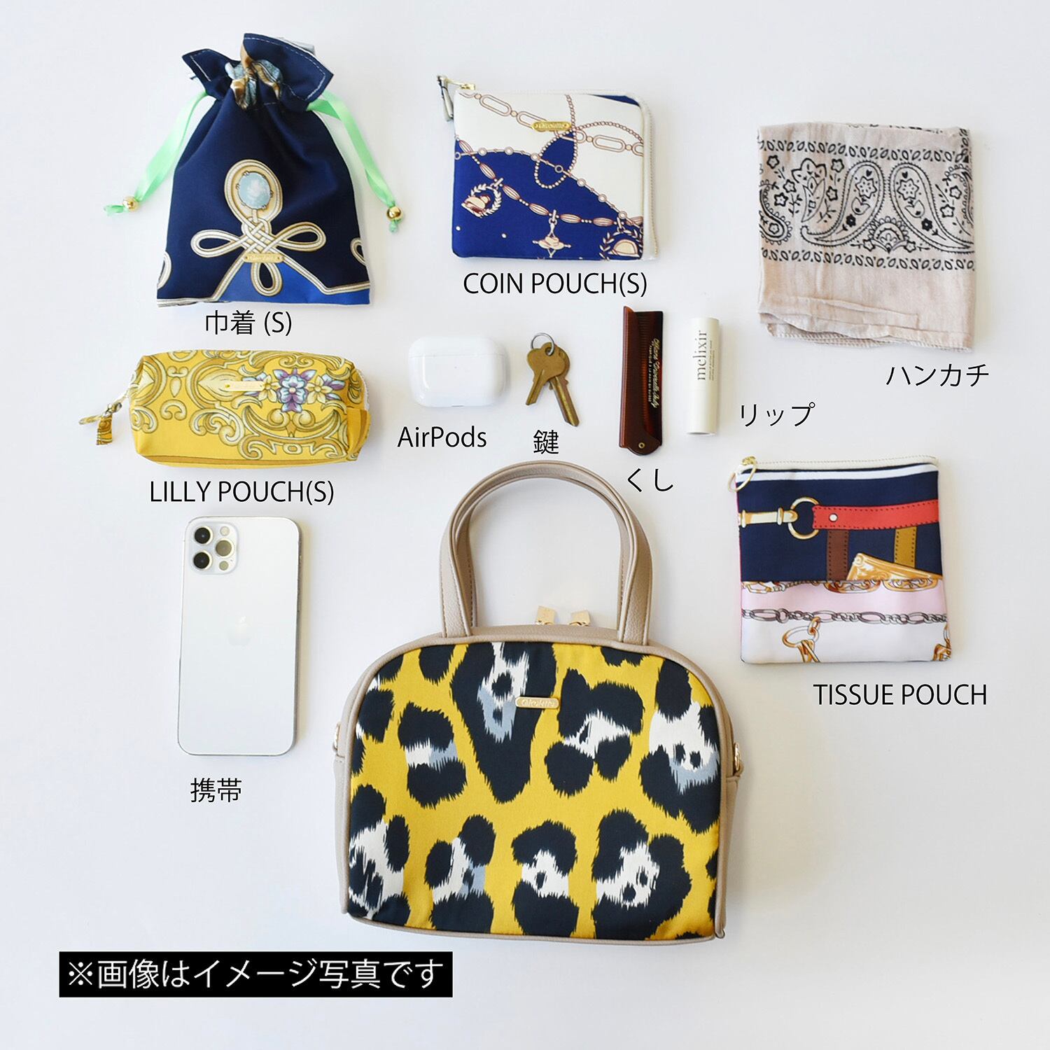 小さめなサイズ感ですが、携帯やお財布、ハンカチ、ティッシュポーチなど、見た目以上に入ります。
