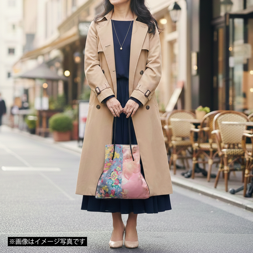 トレンチコートとネイビーのワンピースに、ピンクの和柄のPIPINGBAG。女性らしい印象に◎