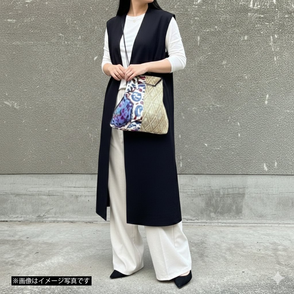白のトップスに黒のロングジレ。和柄の色味で爽やかで洗練された印象に。