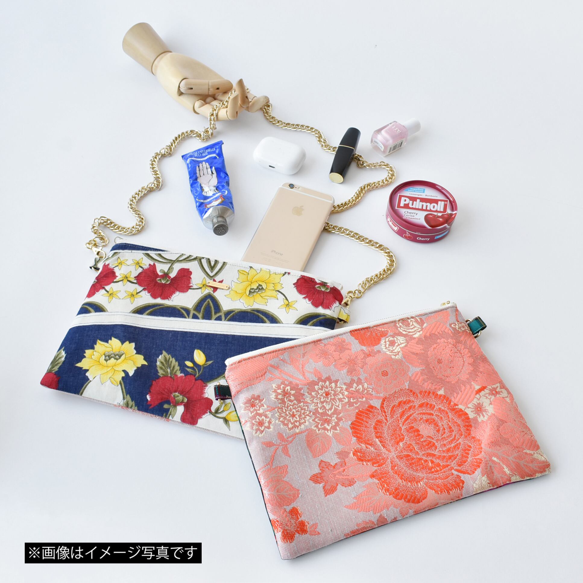 A classic flat pouch crafted from recycled scarves and Japanese textiles.