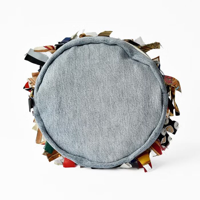 カットしたヴィンテージスカーフなどをリメイクした丸型ポシェット。