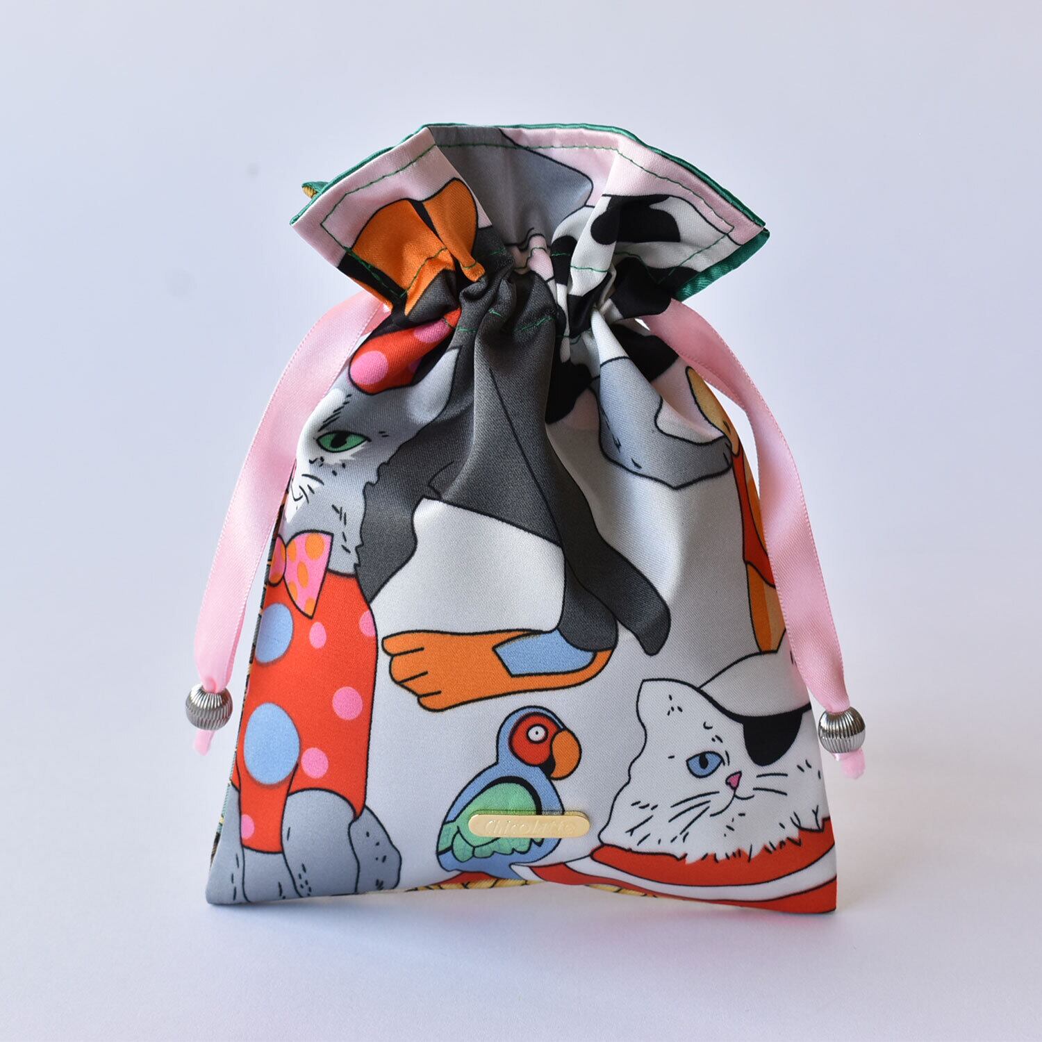 表生地は2種類のスカーフを使用しており、スカーフの切替が楽しい一点もの巾着。
