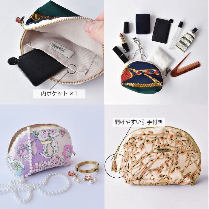 ファスナーがラウンド型に開く人気のポーチはアイテムの出し入れがしやすく、コンパクトでバッグの中でもかさばりません。