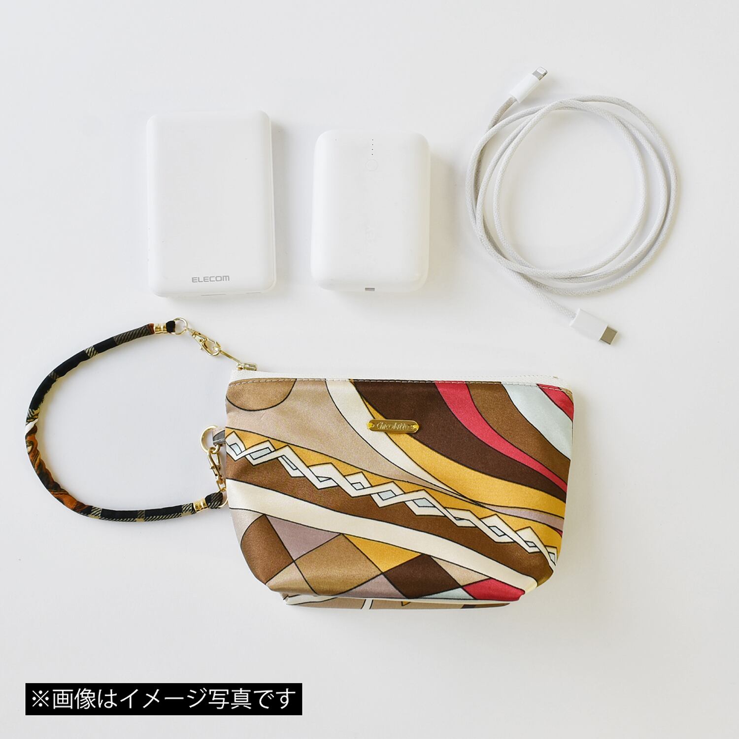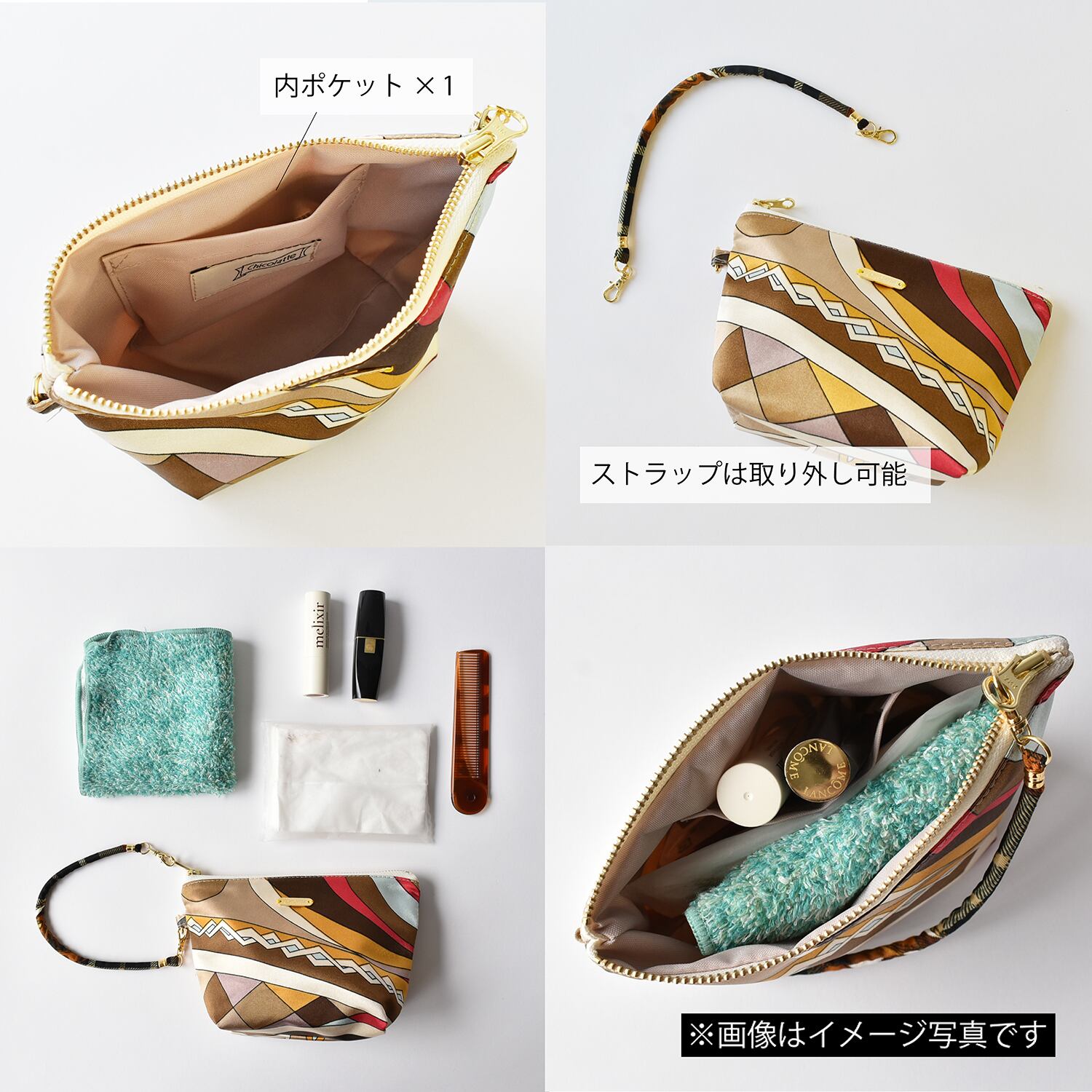 日常使いに便利なストラップ付きのポーチ。