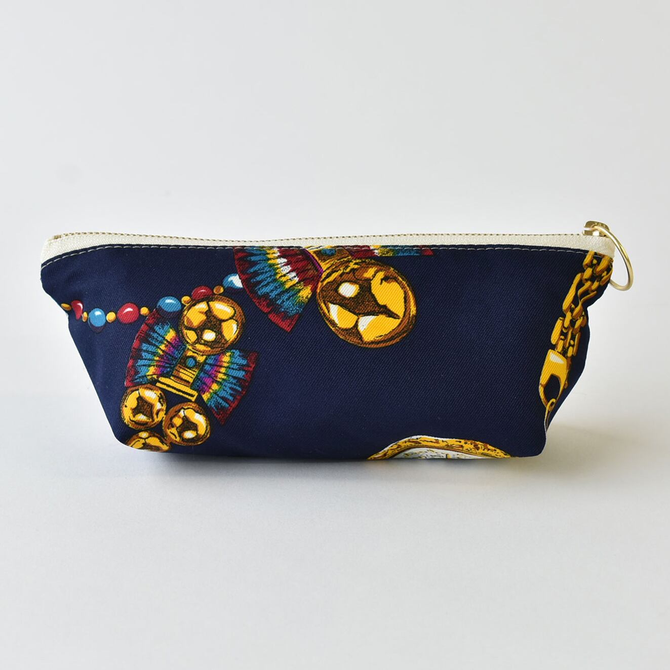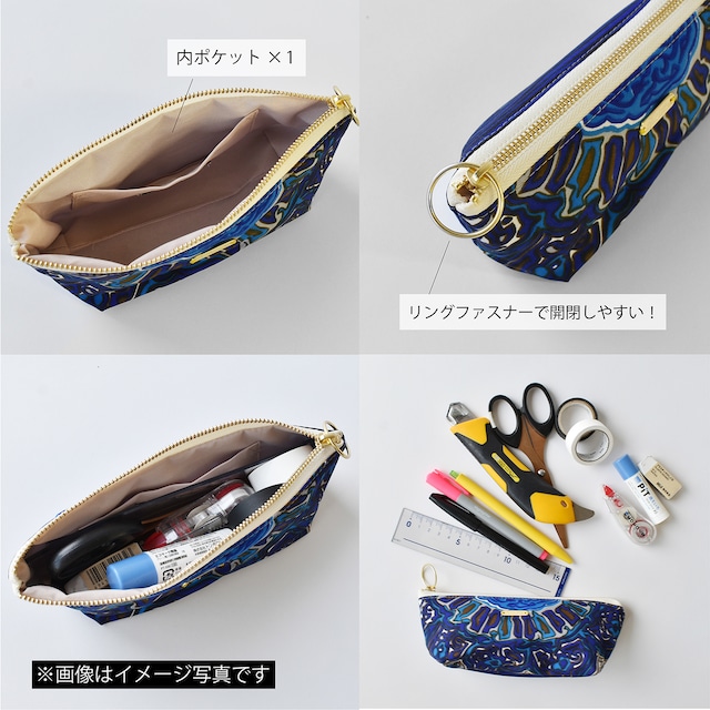 リングファスナーで開けやすい、マチが大きめの横長ポーチ。