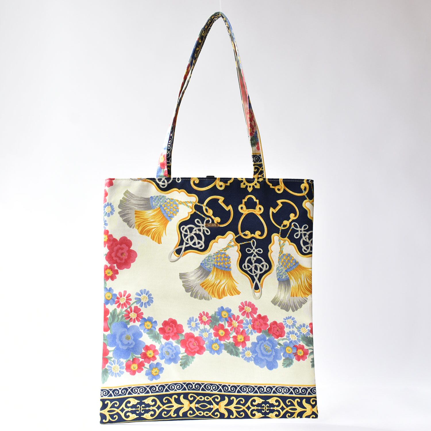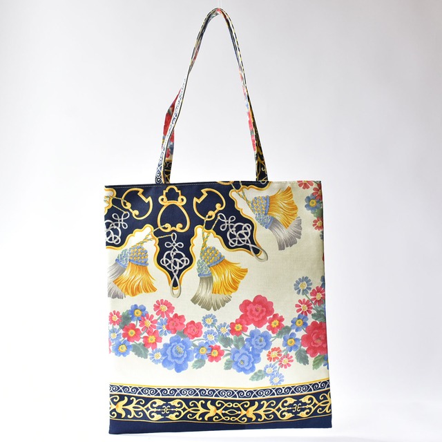 スカーフ裏に柔らかい芯地を合わせて折畳しやすいタイプのトートバッグとなります。
