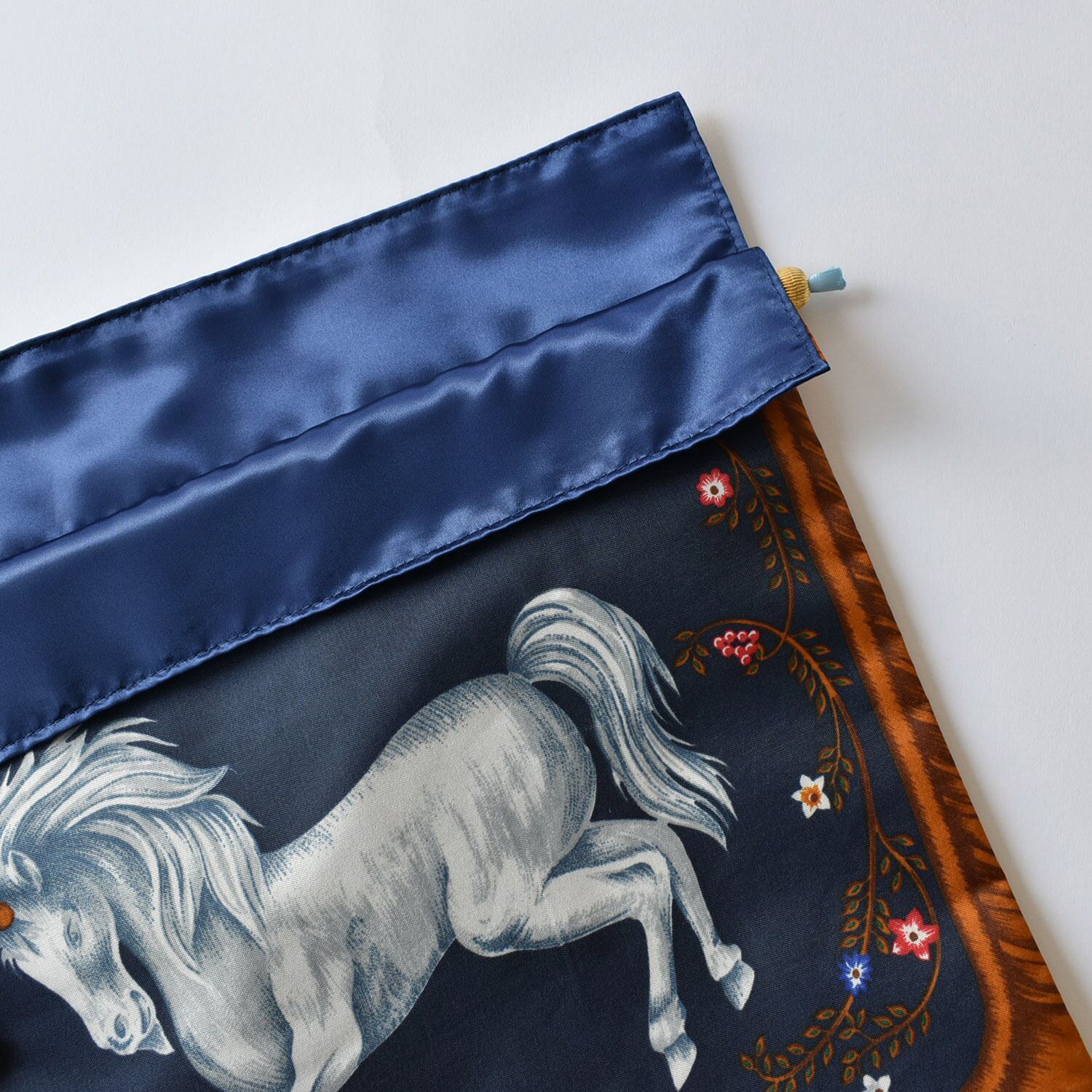 表生地は2種類のスカーフを使用しており、スカーフの切替が楽しい一点もの巾着。