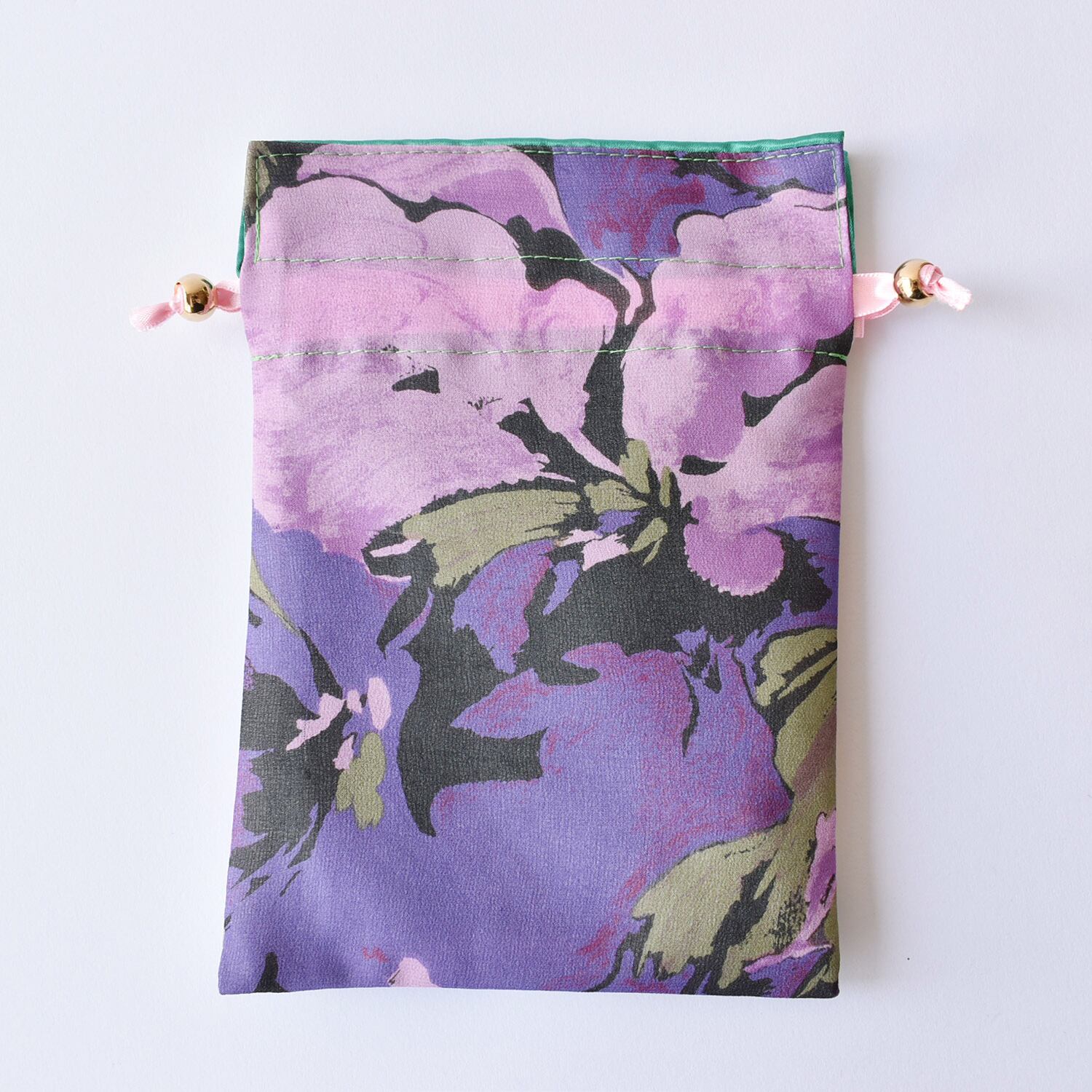 表生地は2種類のスカーフを使用しており、スカーフの切替が楽しい一点もの巾着。