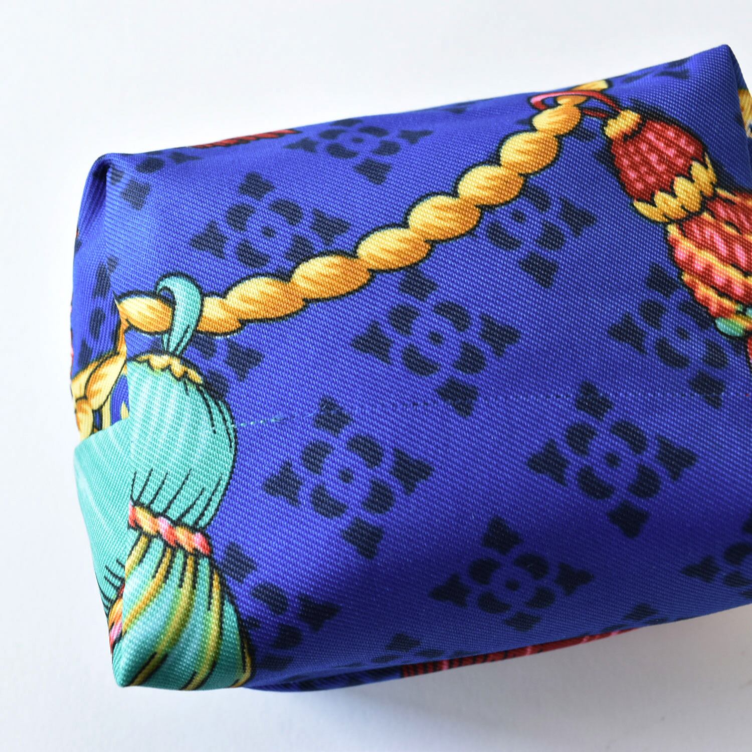 スカーフをリメイクしたコロンとマチが大きめのミニ俵型ポーチ。