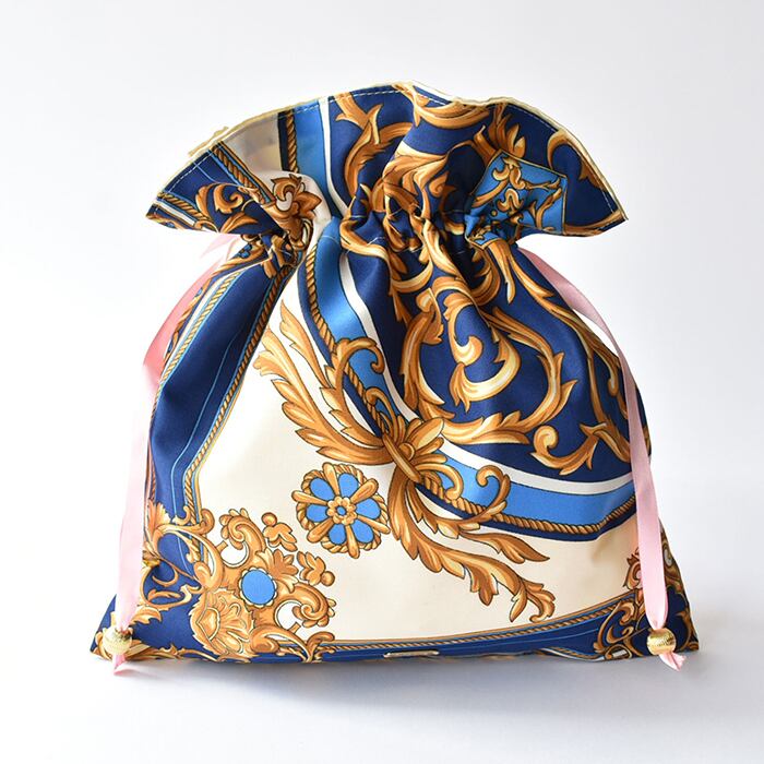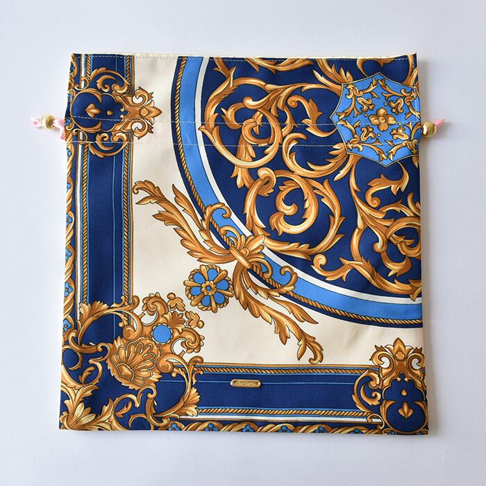表生地は2種類のスカーフを使用しており、スカーフの切替が楽しい一点もの巾着。