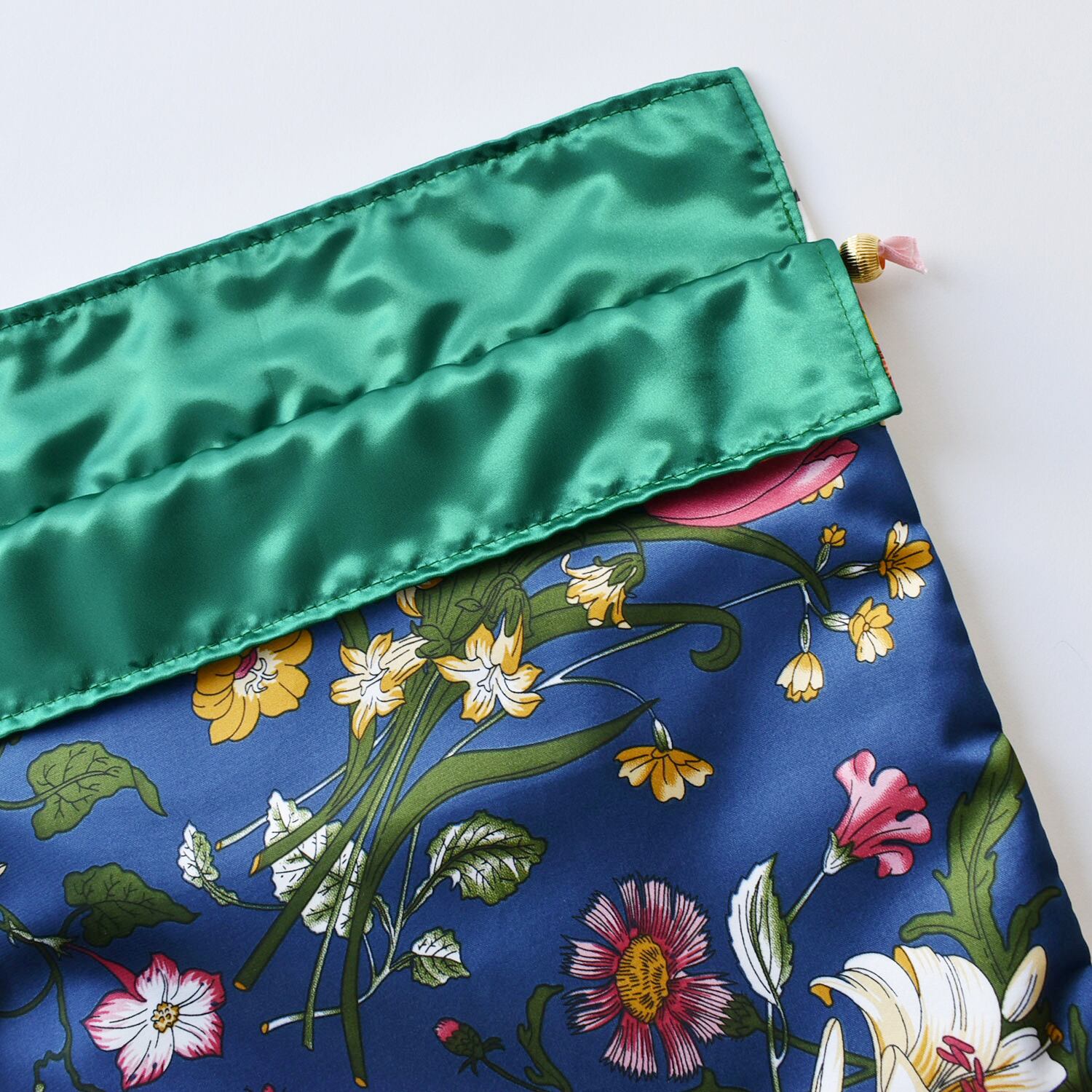 表生地は2種類のスカーフを使用しており、スカーフの切替が楽しい一点もの巾着。