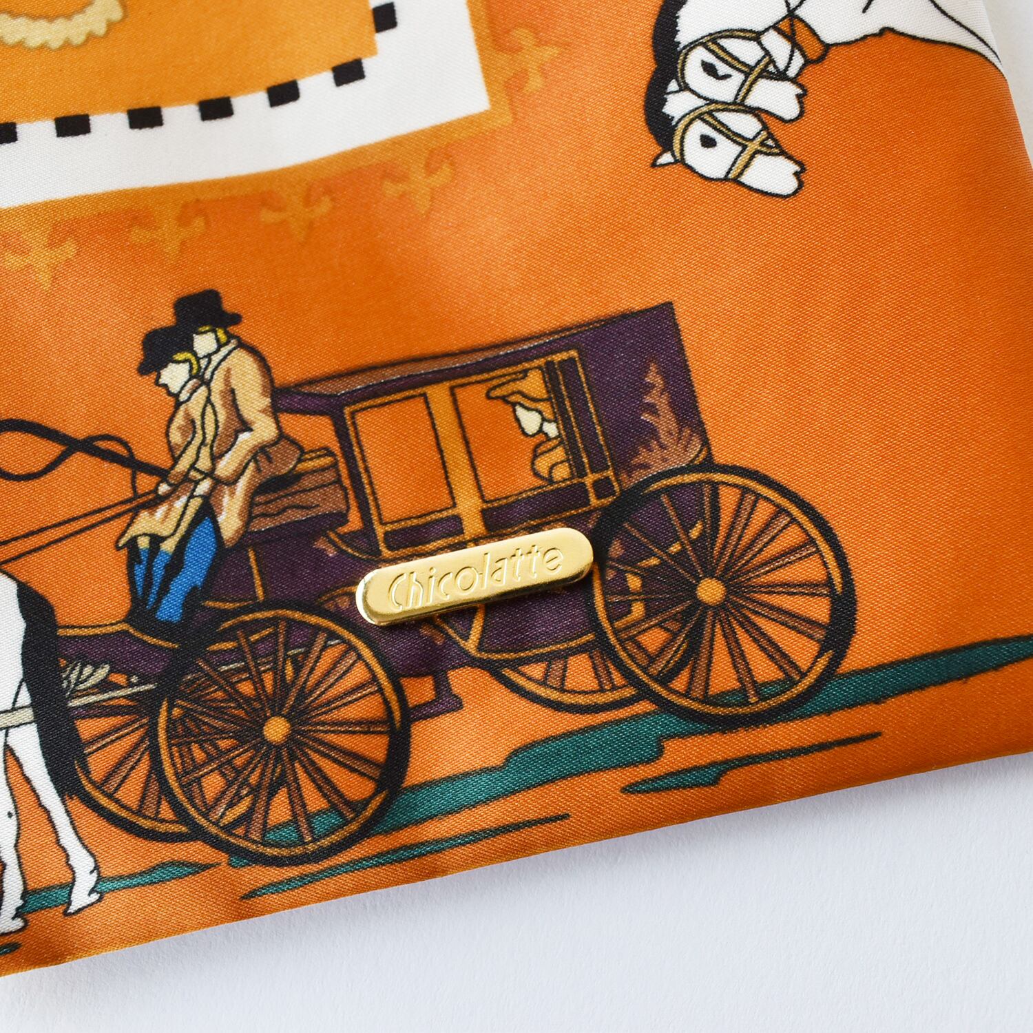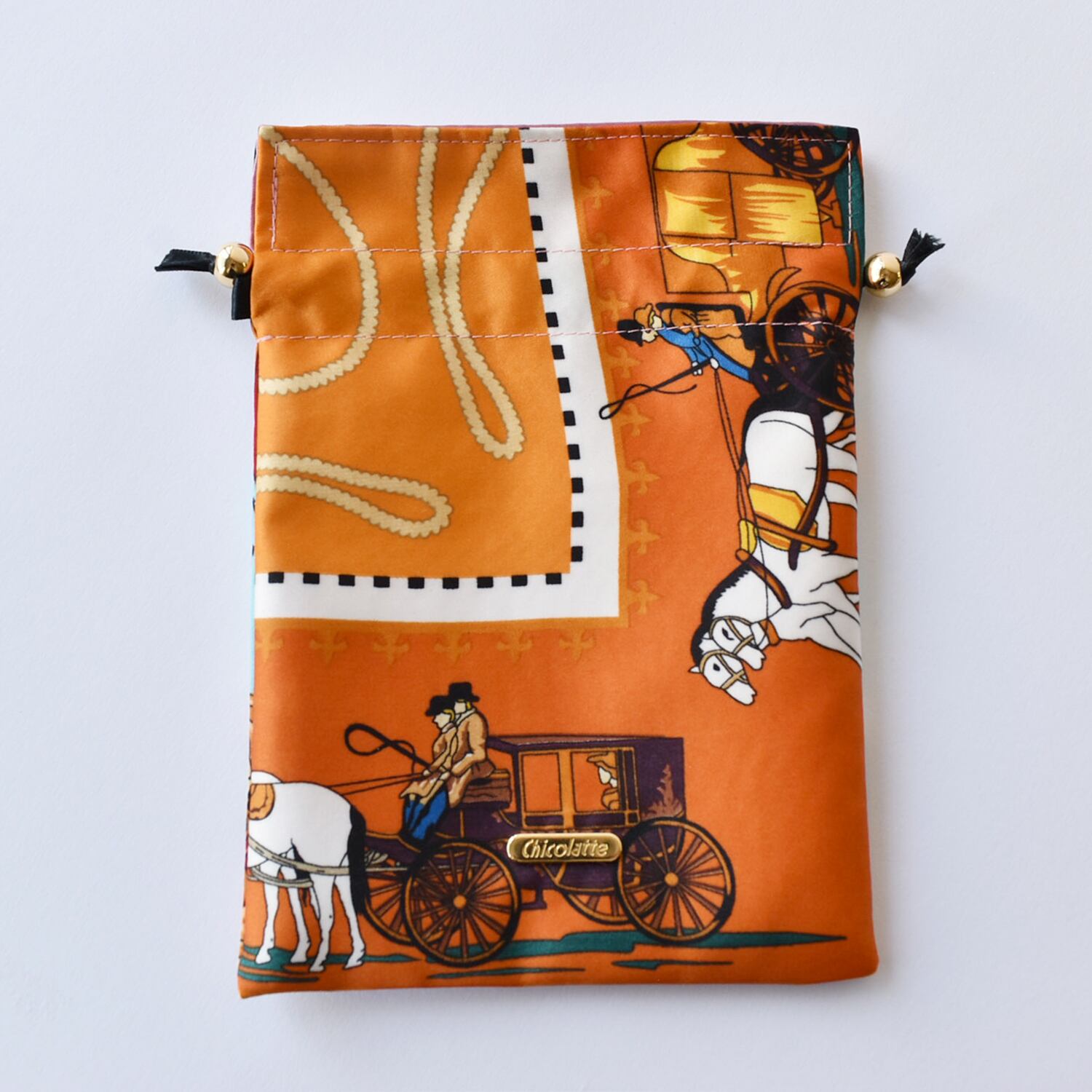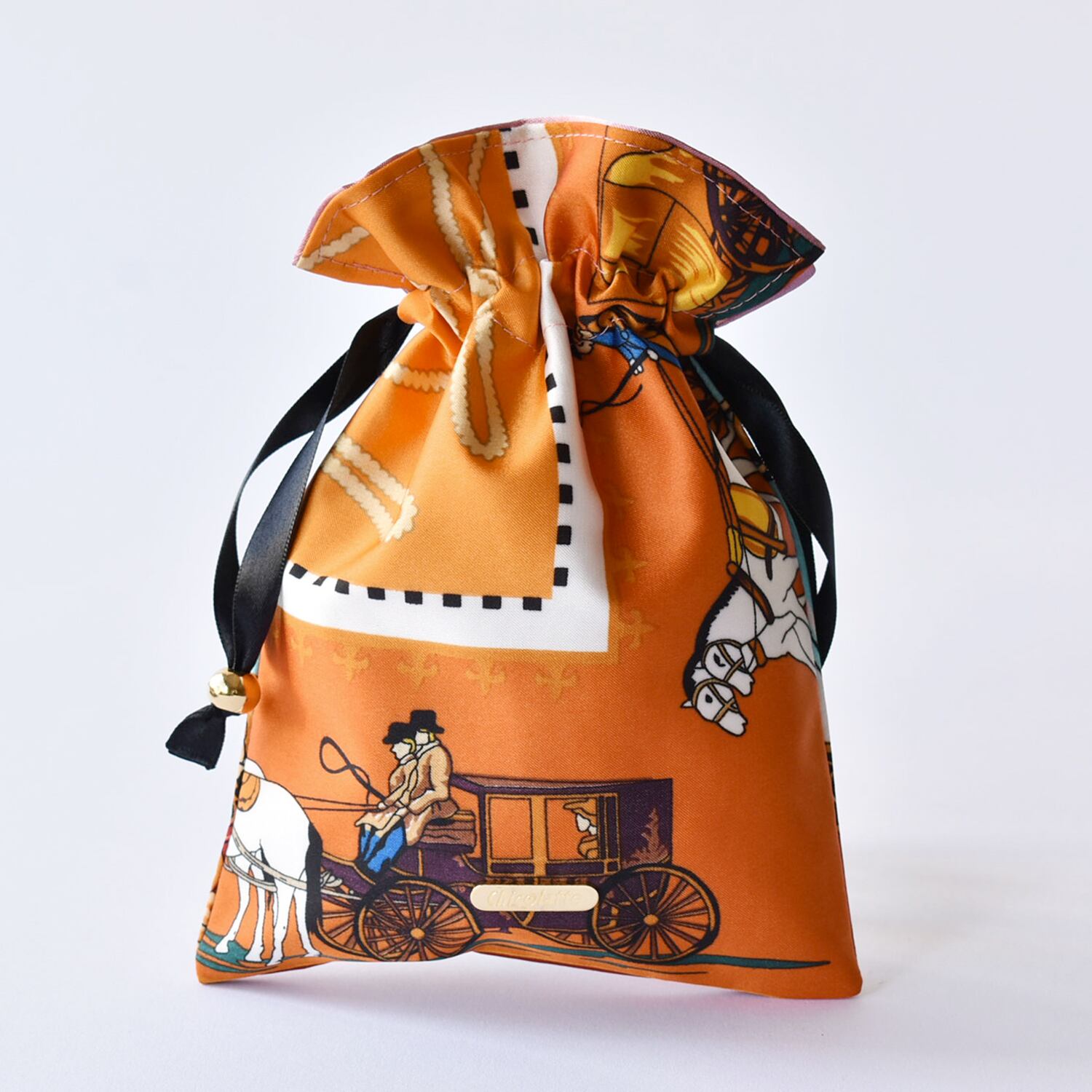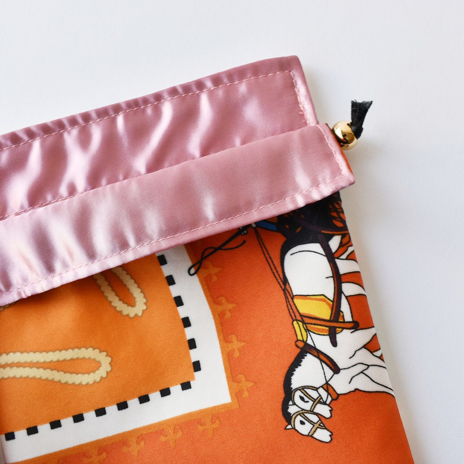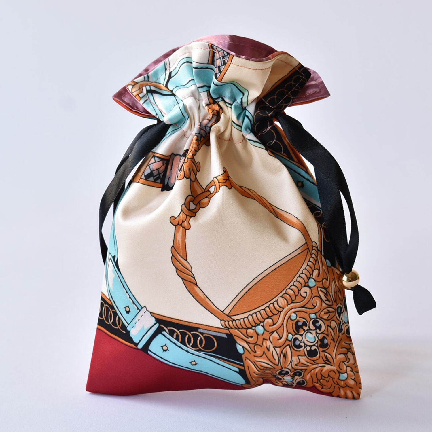 表生地は2種類のスカーフを使用しており、スカーフの切替が楽しい一点もの巾着。
