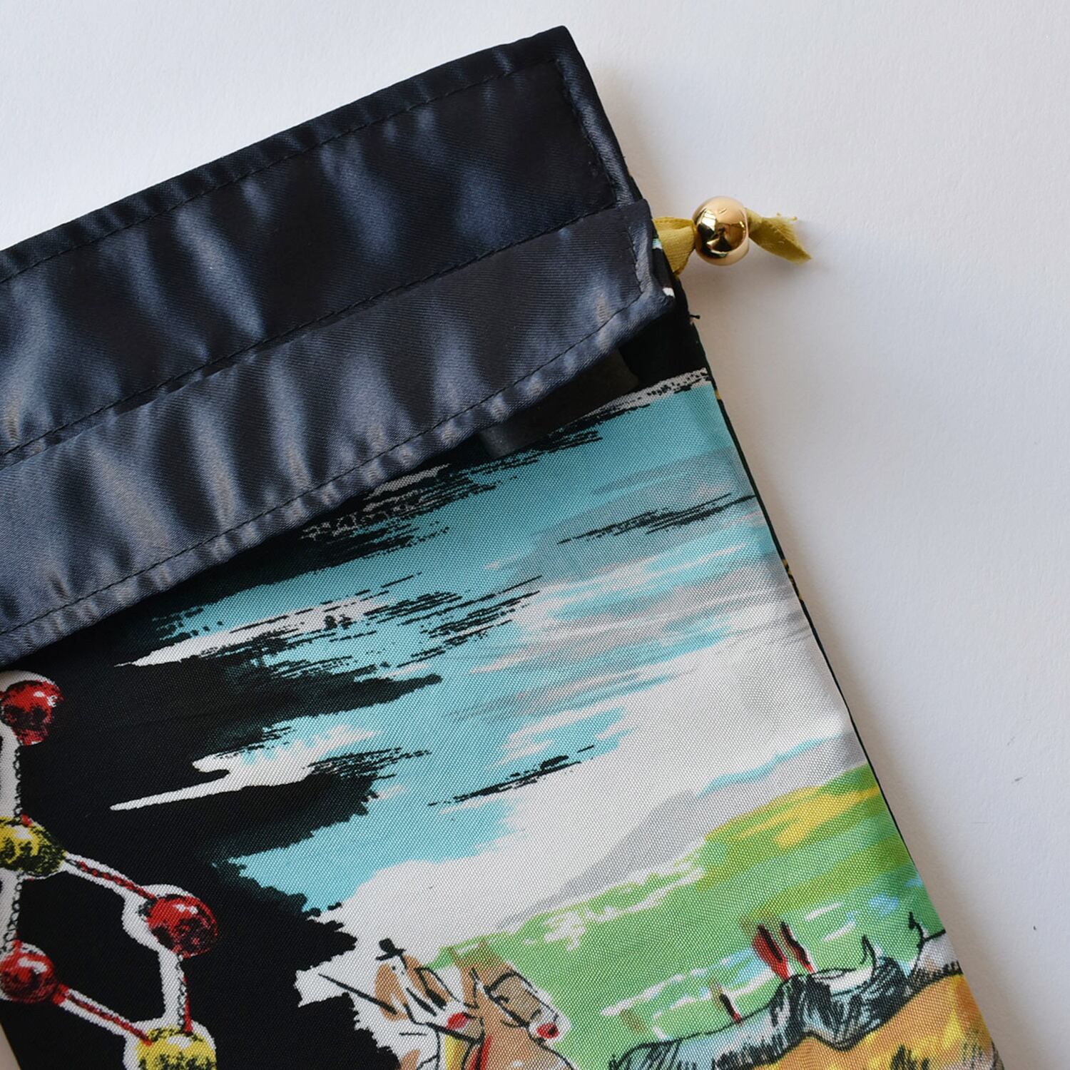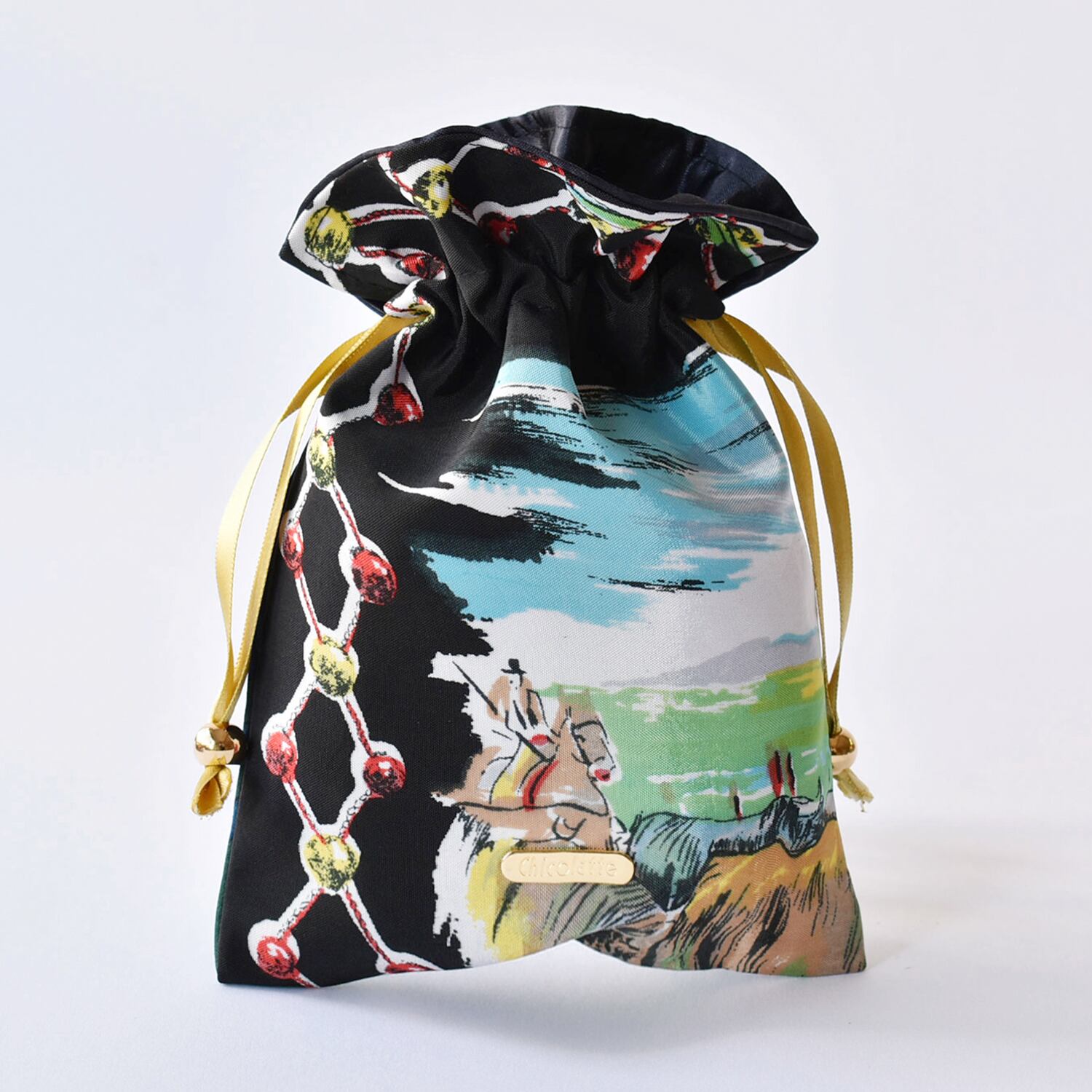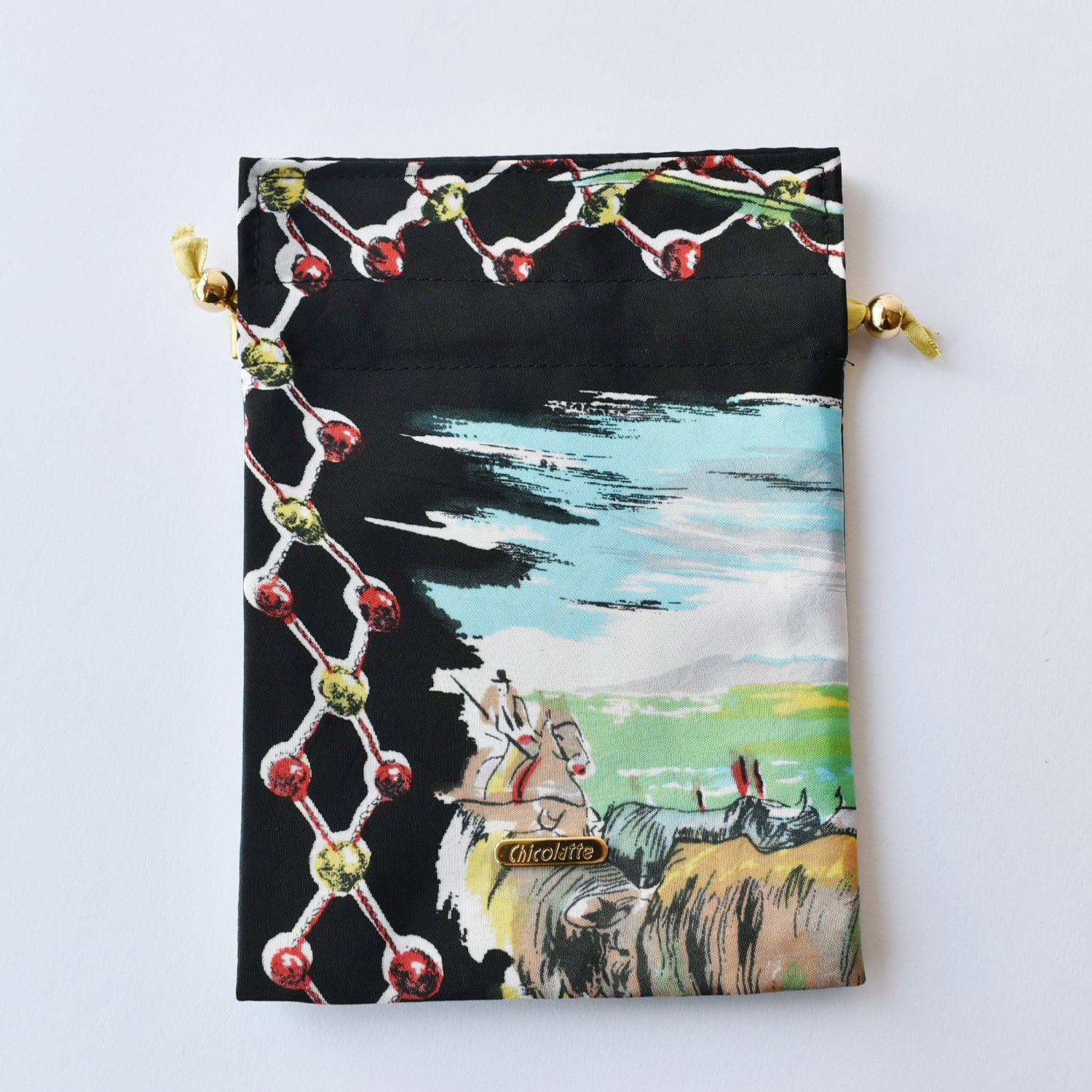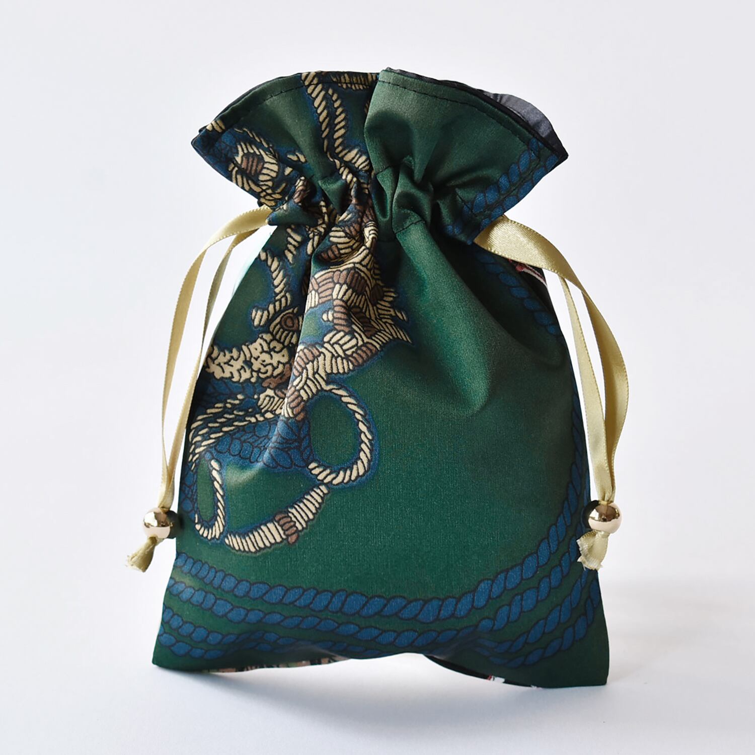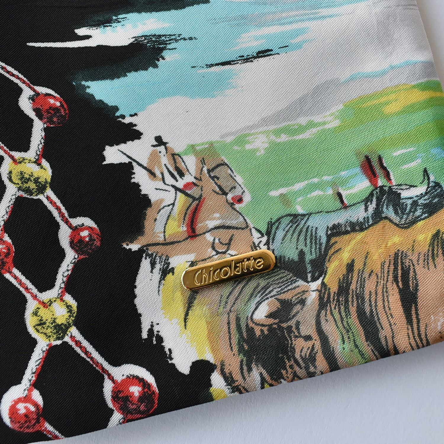 表生地は2種類のスカーフを使用しており、スカーフの切替が楽しい一点もの巾着。