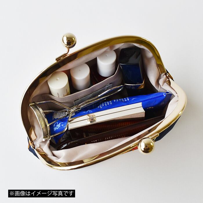 ミラーやビューラー、ハンドクリームなど、大きめのアイテムもしっかり入るがま口ポーチ。