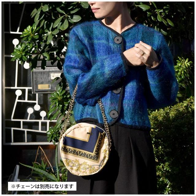 ヴィンテージスカーフをリメイクした丸型ポシェット。