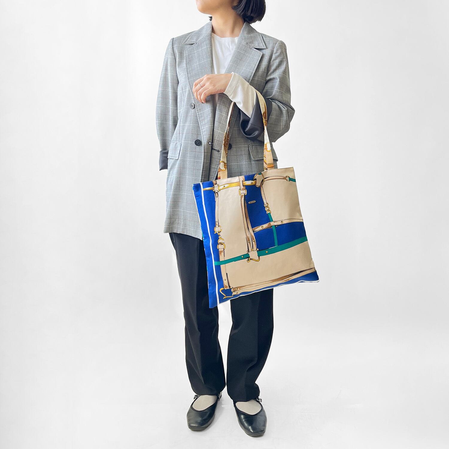 スカーフ裏に柔らかい芯地を合わせて折畳しやすいタイプのトートバッグとなります。