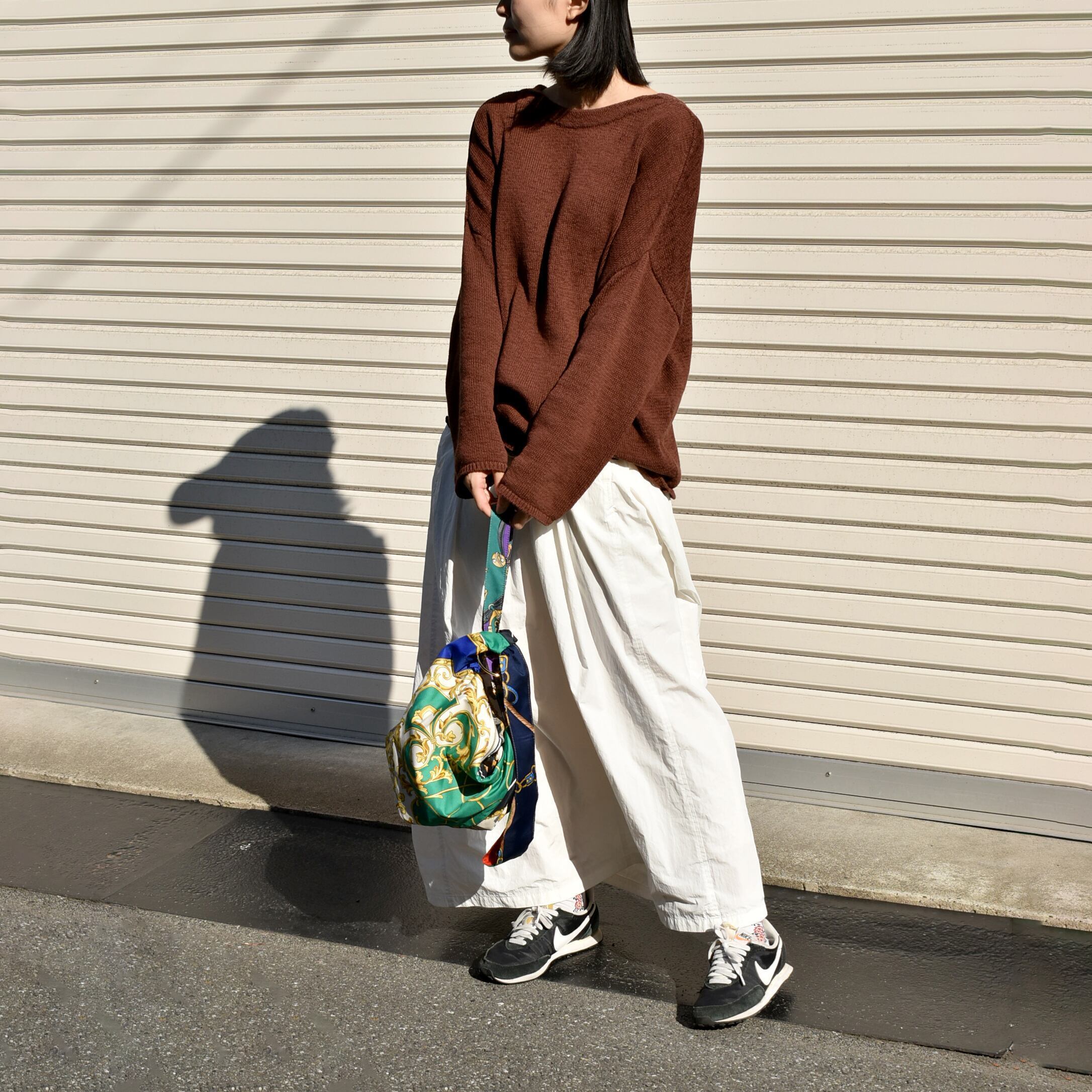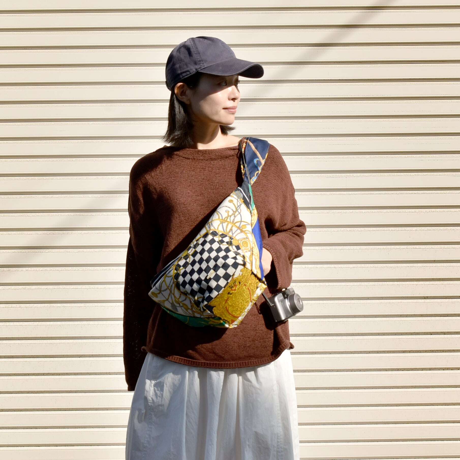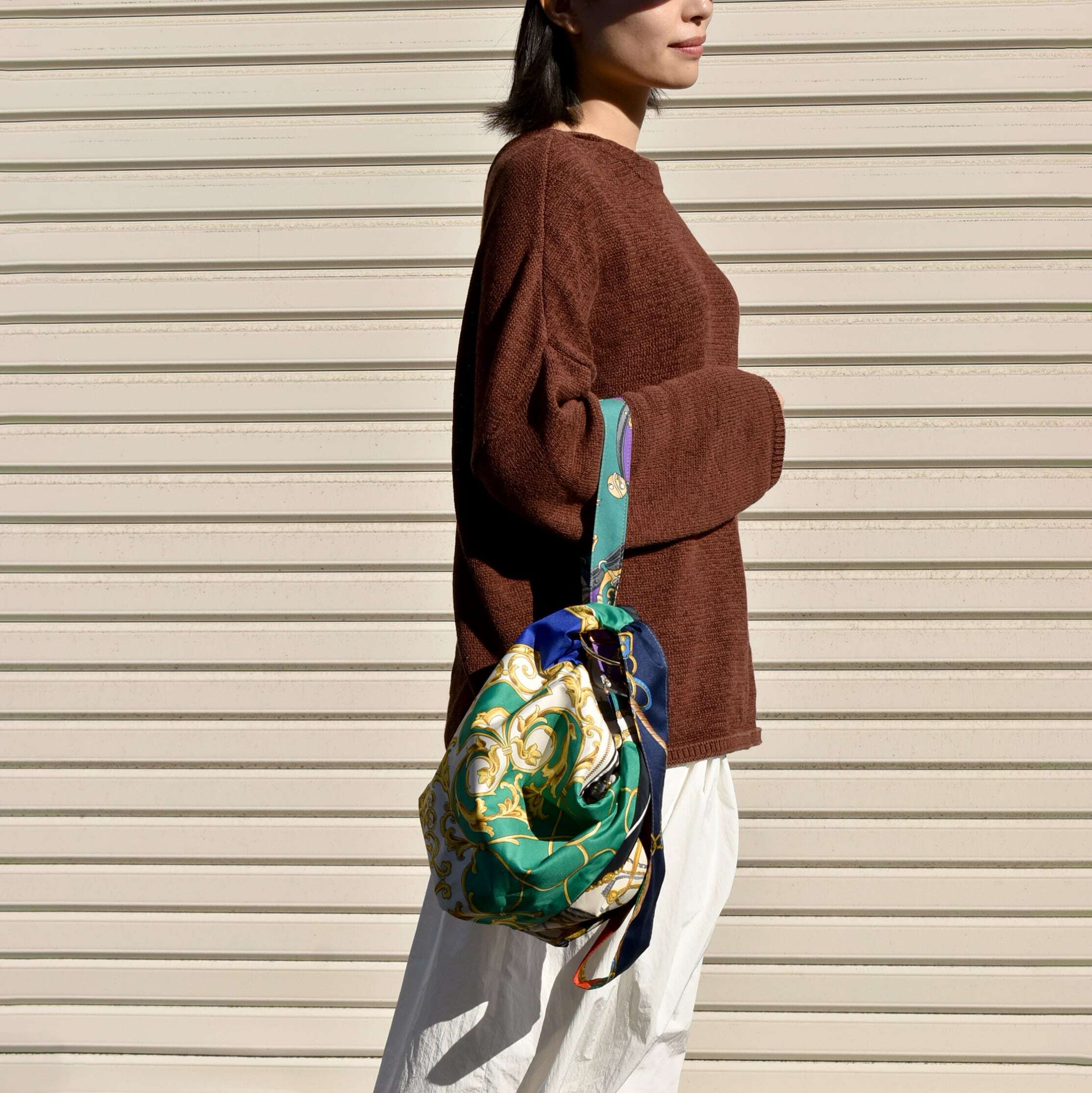 手持ちにした際に「クシュ」っとなる形がキュートでヴィンテージスカーフの素材の柔らかさも
